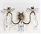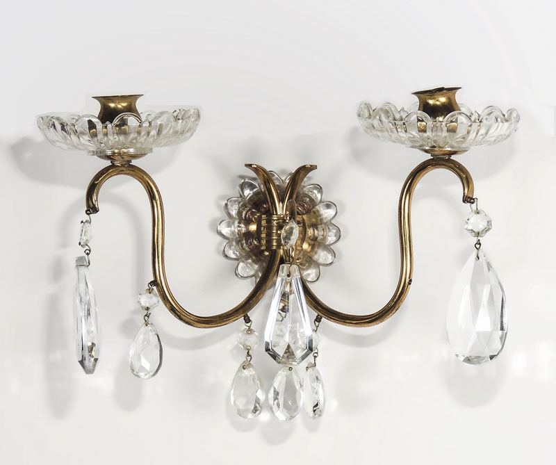 SERIE DI CINQUE APPLIQUES IN METALLO DORATO due bracci portacandela a doppia voluta con pendenti a goccia in cristallo, difetti A SET OF FIVE GILDED METAL WALL LAMPS