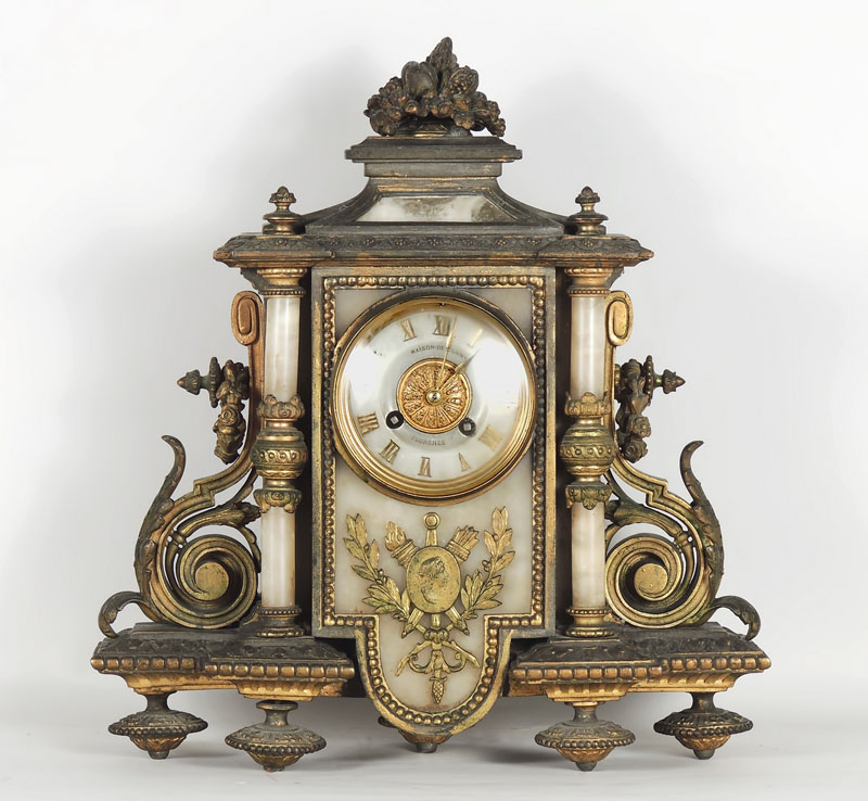 OROLOGIO DA MENSOLA A TEMPIETTO IN BRONZO DORATO E ALABASTRO Francia, Barrard&Vignon, metà del XIX secolo sormontato da trionfo di frutti, quadrante in alabastro (difetti), al di sotto bassorilievo con Allegoria della Vittoria, colonne laterali in alabastro base sagomata e sbalzata h cm 37,5x34,5x15 GILDED METAL AND ALABASTER MANTEL CLOCK, FRANCE, BARRARD&VIGNON, MID 19TH CETURY