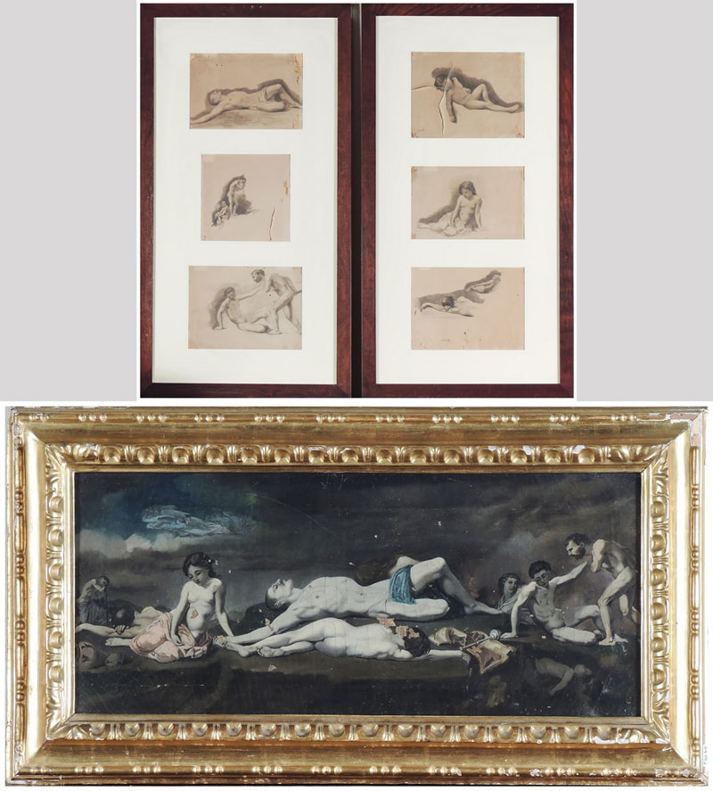 GIOVANNI DUPRÈ (1817-1882) Il Martirio dei Maccabei olio si tela, corredato di serie di sei bozzetti preparatori a matita su carta, in cornice cadute di colore e difetti la tela cm 25x43,5, i bozzetti cm 18x18, cm 16x23 circa (7) THE MARTIRIOUS OF MACCABEI, OIL ON CANVAS AND SIX SKETCHES ON PAPER