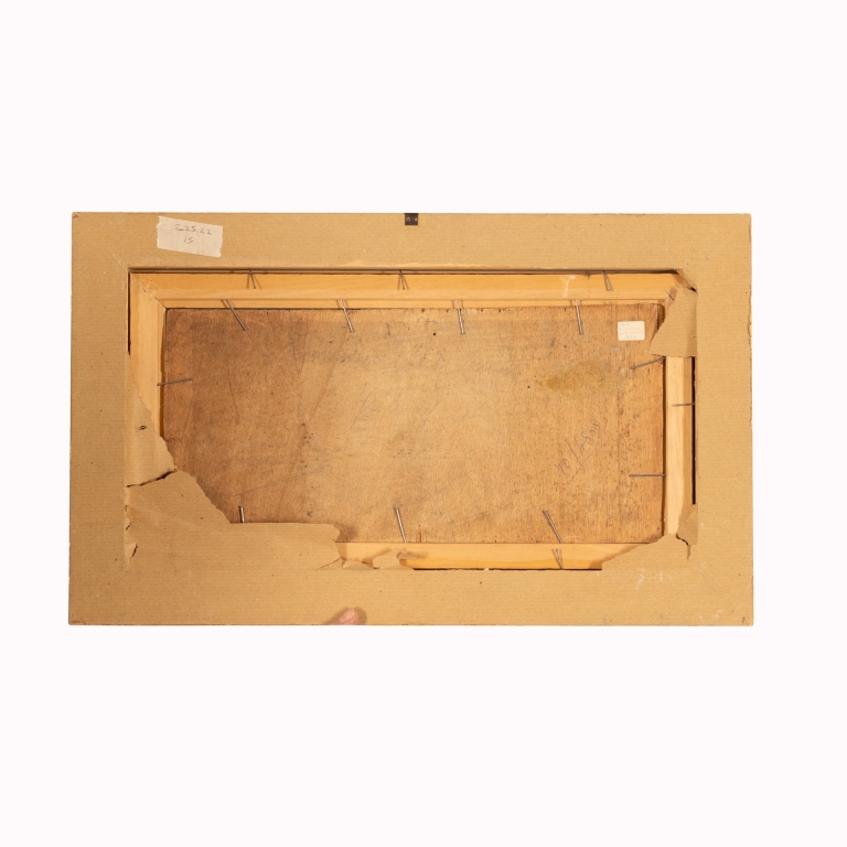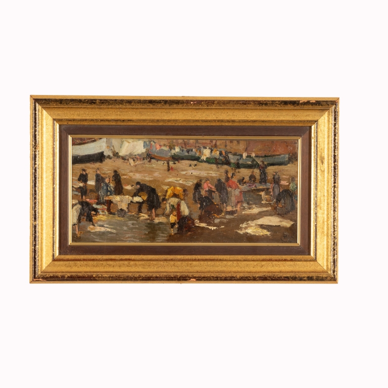 Rientro delle barche dalla pesca a Sestri Levante olio su tavola cm 19x40; con cornice cm 32,5x53,5