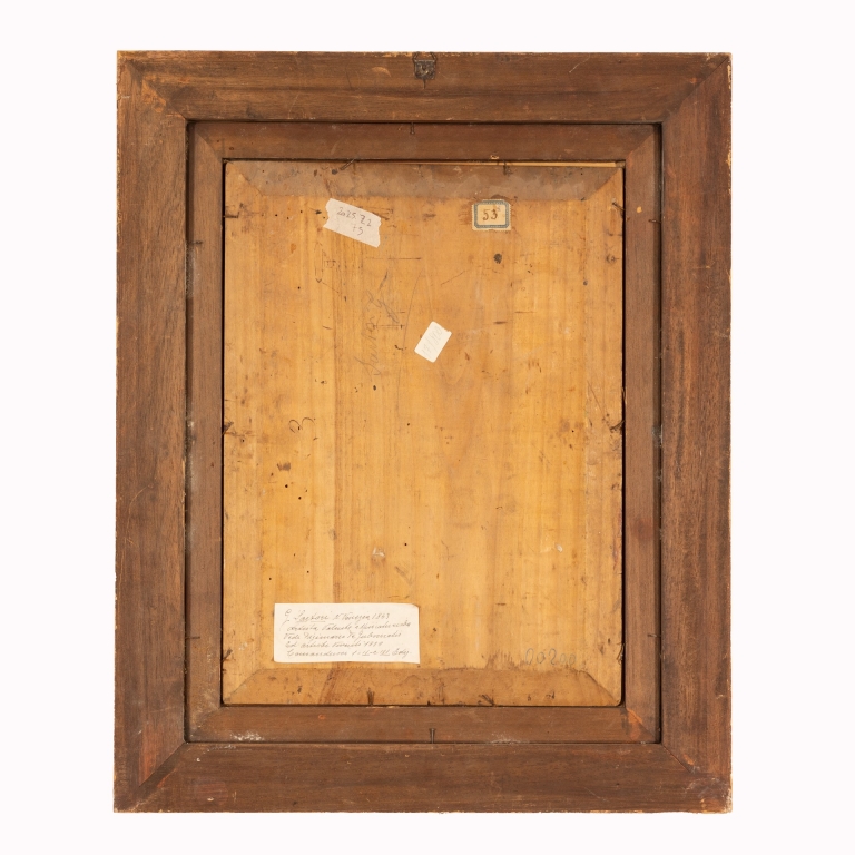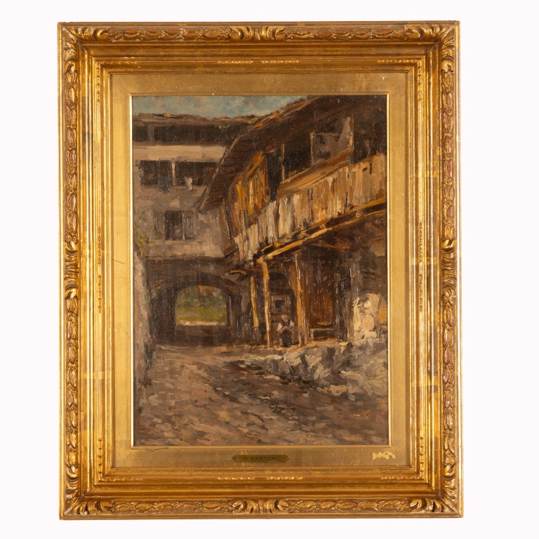 Giuseppe Sartori (Venezia, 1863 - Padova, 1922) Scorcio di caseggiato Fine XIX secolo inizi XX sec olio su tavola cm 46x33; con cornice cm 62x50