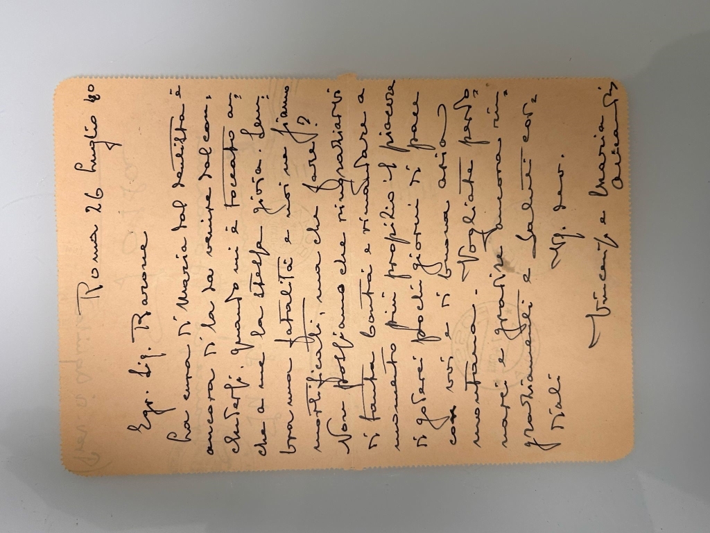 55) Busta lettera al Barone Francesco Bonanni di Fossa a nome di Vincenzo e Maria Alicandri. All'interno roma 26 luglio 40 Egr. Sig. Barone la cura di Maria tal prevista è ancora di là da venire tal con chiederli quanto mi è toccato anche a me la stessa gioia. Sembra una fatalità e noi ne siamo mortificati, ma che fare? Non possiamo che ringraziarvi di tanta bontà e rimandare a momento più propizio il piacere di goderci pochi giorni di pace con voi e di buona aria montana. Vogliate perdonarci e gradire ancora ringraziamenti e saluti cordiali. Dev. Vincenzo e Maria Alicandri.