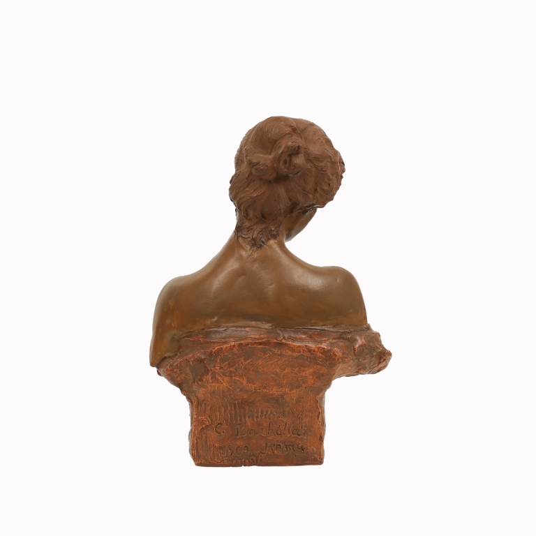 La scultura ritrae una giovane donna a seno nudo con i capelli ondulati che le cingono il volto colto in una espressione pensierosa.