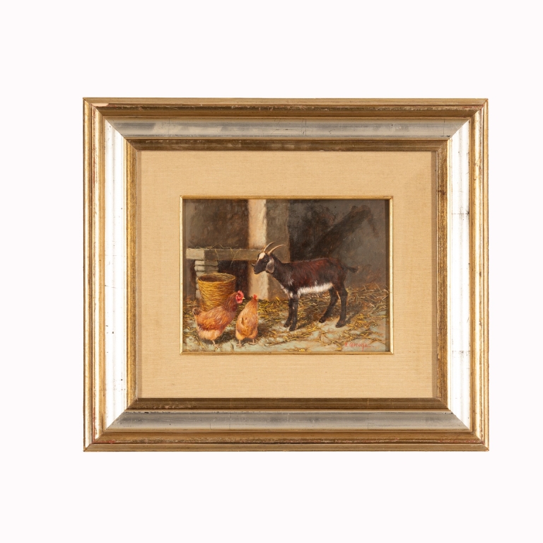 Eduardo Cerrone (Napoli, 1935 - Napoli, 2010) Capra e gallina nella stalla olio su tavola cm 17,5x22,5; con cornice cm 39x44,5