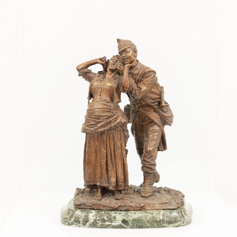 Il gruppo scultoreo poggia su sottile basamento a sezione rettangolare. Su un terreno erboso sono rappresentati, stanti e frontalmente, una figura femminile che solleva un braccio in segno di sorpresa e con la mano solleva quella del soldato dietro le sue spalle che le copre le palpebre. La donna, scalza, indossa una camicia con le maniche rimboccate; un golfino girocollo con colletto ricamato; un alto corsetto; lunga gonna; intorno alla vita è legato un grembiule che, con ampie pieghe, scende fino a mezza gamba. Il soldato con baffi, in uniforme con stivali, porta due bisacce ed un cannocchiale a tracolla