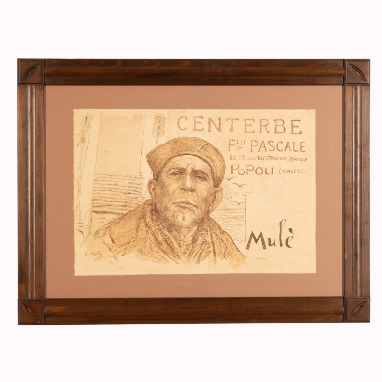 Un monocromo marrone si staglia in primo piano la figura del vecchio marinaio di Ortona chiamato "Mulè" come riportato dalla scritta in basso a destra, dietro di lui cordami e un albero della barca