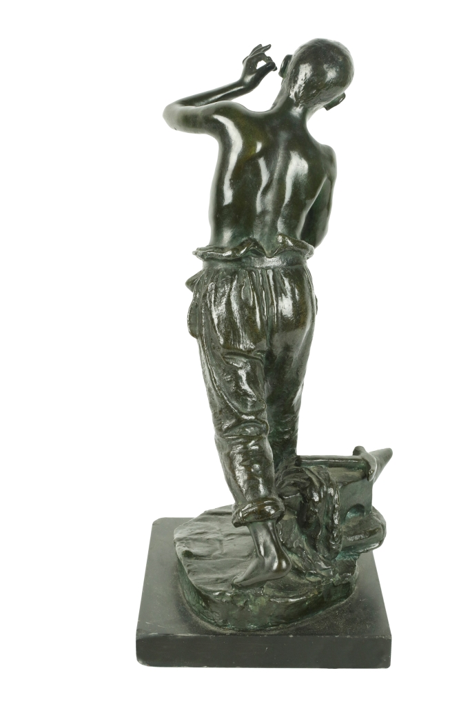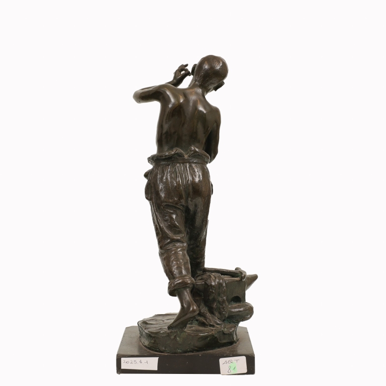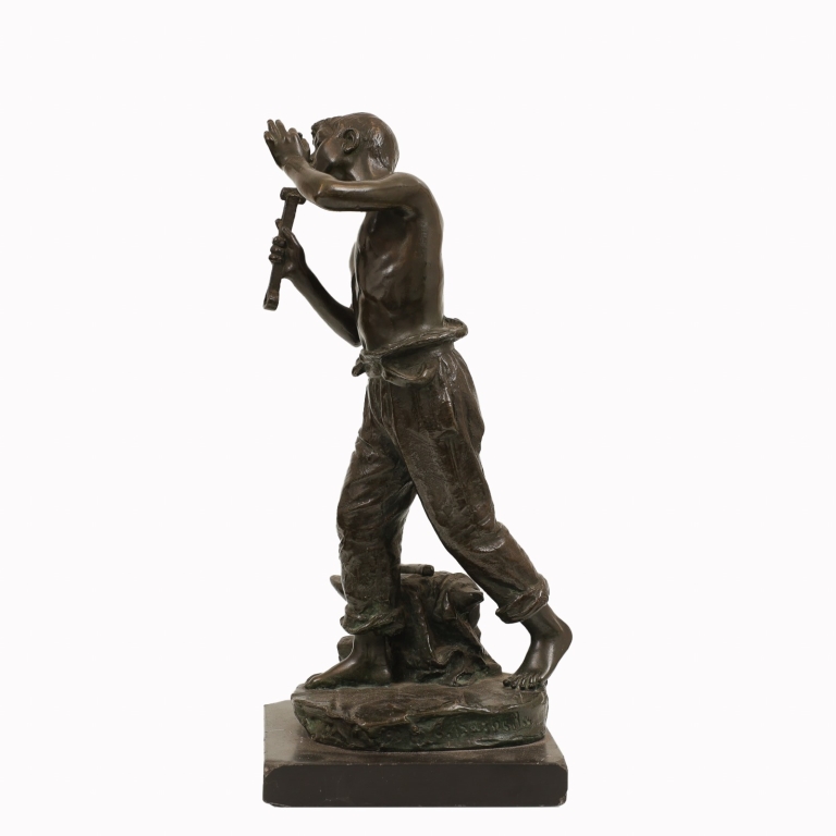 Bronzo a cera persa rappresentante un giovane maniscalco a torso nudo con in mano una tenaglia che regge un tizzone ardente col quale sta per accendersi un sigaro che ha nell'altra mano. Ai suoi piedi un martello poggiato su un'incudine.