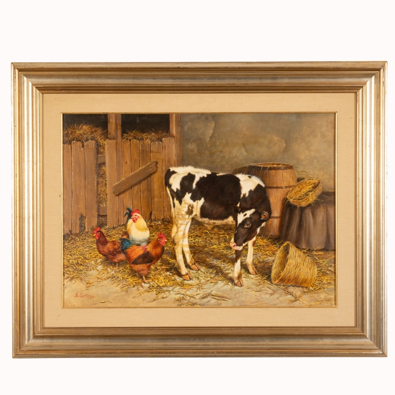 Eduardo Cerrone (Napoli, 1935 - Napoli, 2010) Mucca e gallina nella stalla olio su tela cm 50x70; con cornice cm 75x94