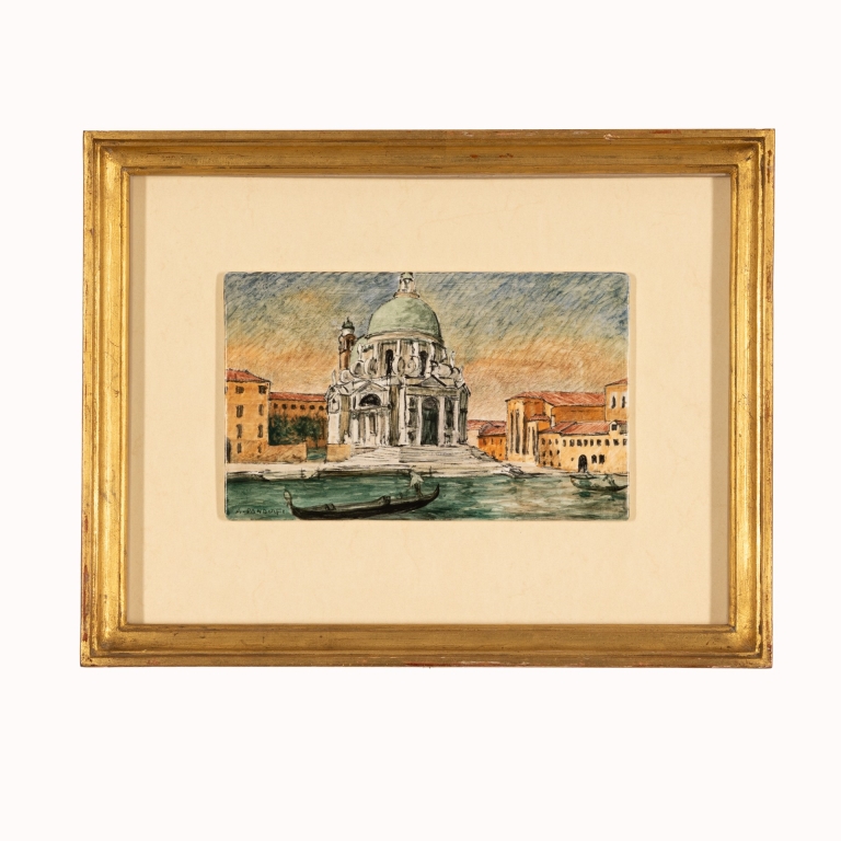 Alessandro Pandolfi (Castellammare Adriatico, 1887 - Pavia, 1953) Panorama di Venezia dal mare con la centro la Basilica di Santa Maria della Salute cm 16,3 x 26,4; con cornice cm 34,5x44,3