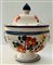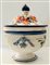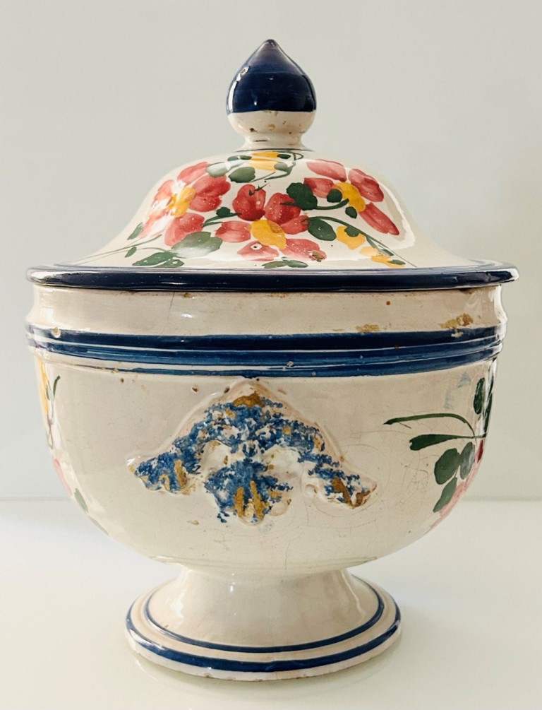 Manifattura di Castelli degli inizi del XX secolo Zuppiera con decoro floreale e due prese floreali a rilievo.