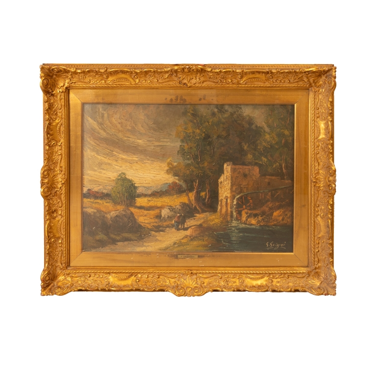 Gino Grignani (XX secolo - ) Viandanti in paesaggio con antico mulino olio su tela cm 59,5x80; con cornice cm 75x95,5