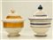 Lotto di due piccole zuppiere, una con decoro a fasce gialle concentriche ed una con linee blu concentriche. Pomi a pigna.