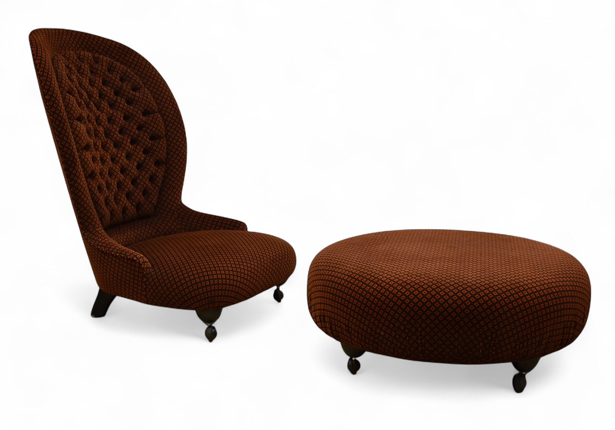 Poltrona + pouf rotondo in legno e tessuto mod. Pole Position Azucena anni '80 / '90