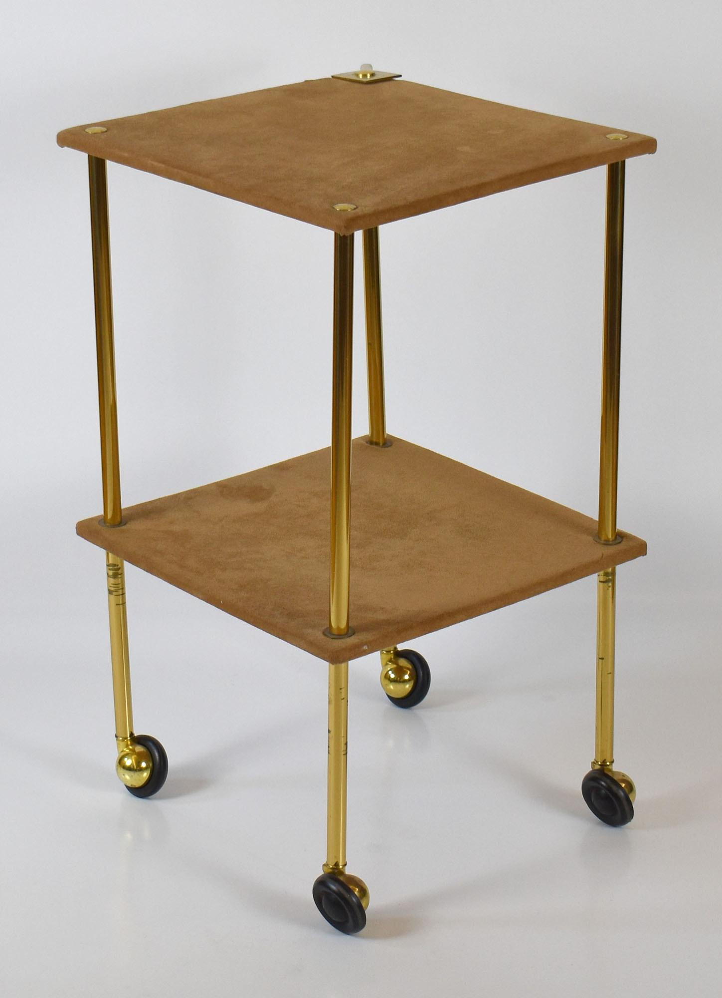 Tavolo a rotelle struttura e maniglia in ottone lucido piani in legno con rivestimento in tessuto produzione Azucena 1957.