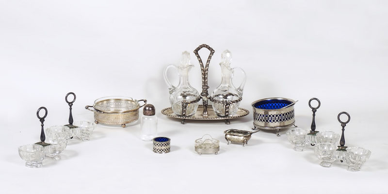 LOTTO DI OGGETTI DA TAVOLA tra cui un'oliera in argento con due ampolle in cristallo, una serie di quattro saliere, alcuni lega tovaglioli in argento ed una formaggiera in metallo argentato, difetti (11)