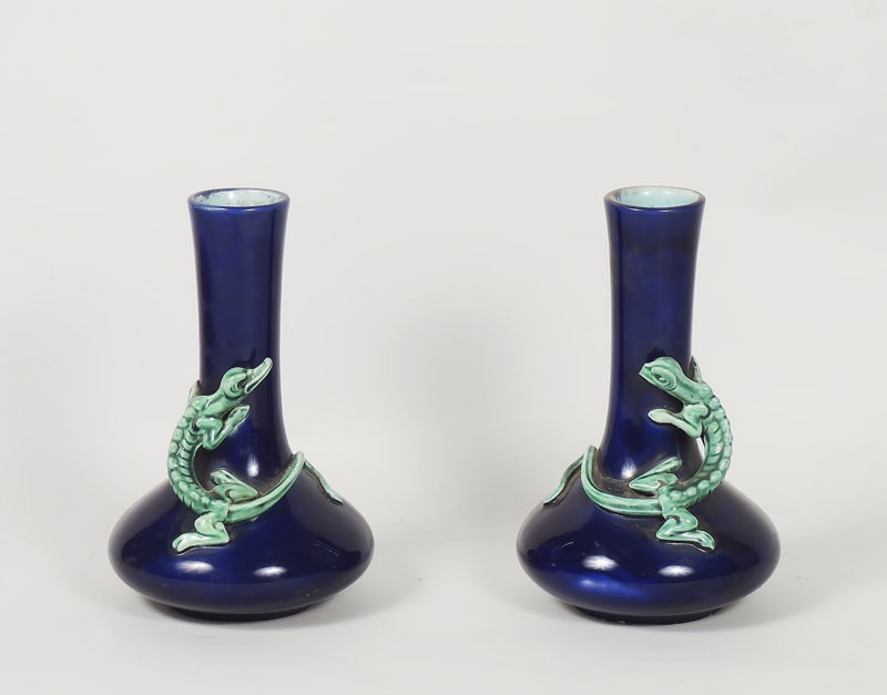 COPPIA DI PICCOLI VASI IN SMALTATI BLU Francia, Sarreguemine, inizio del XX secolo alto collo decorato da figura di lucertola a rilievo, difetti h cm 21 PAIR OF SMALL GLAZED TERRACOTTA VASES, SARREGUEMINE