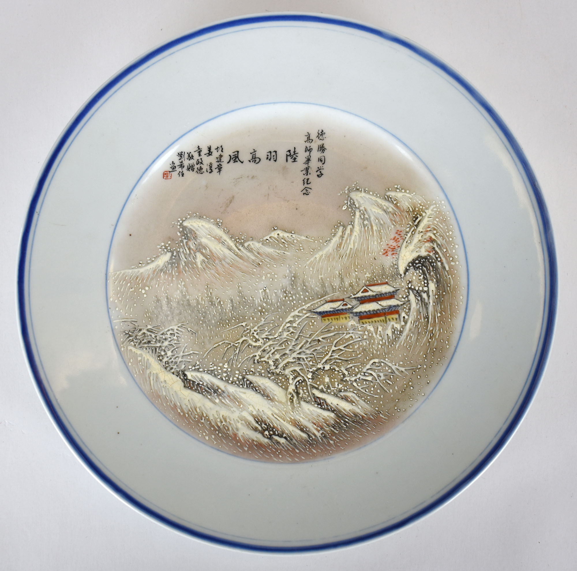 Cina piatto in porcellana decorato con paesaggio montano innevato