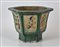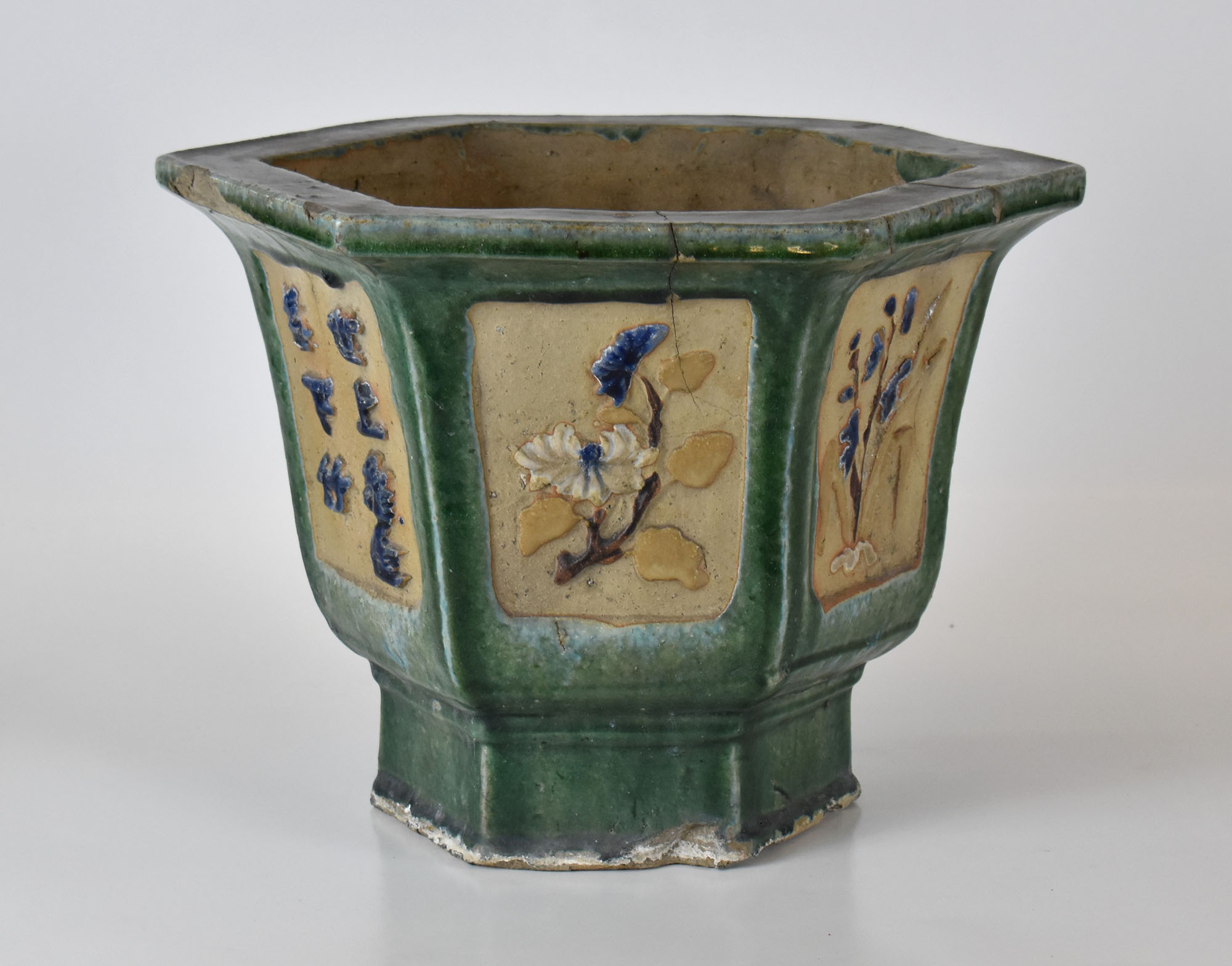 Cina vaso in ceramica decorato con motivi vegetali e scritte in rolievo