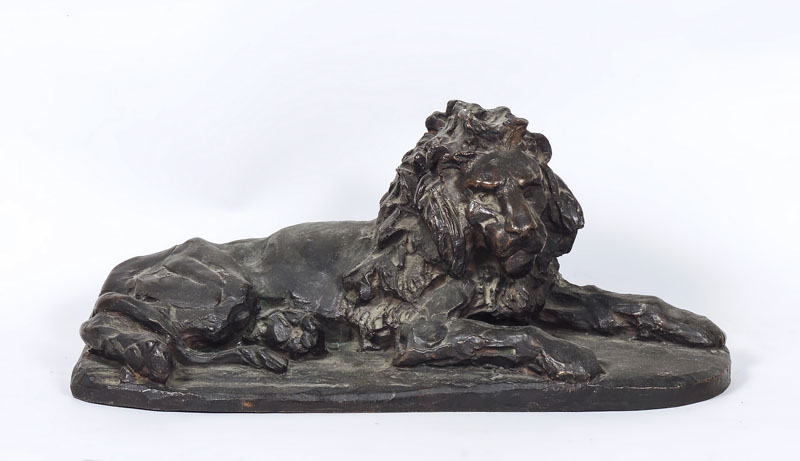 SCUOLA ITALIANA DELLA FINE DEL XIX SECOLO Leone accucciato gruppo in bronzo h cm14,5x37x15 ITALIAN SCHOOL OF LATE 19TH CENTURY, LION, BRONZE