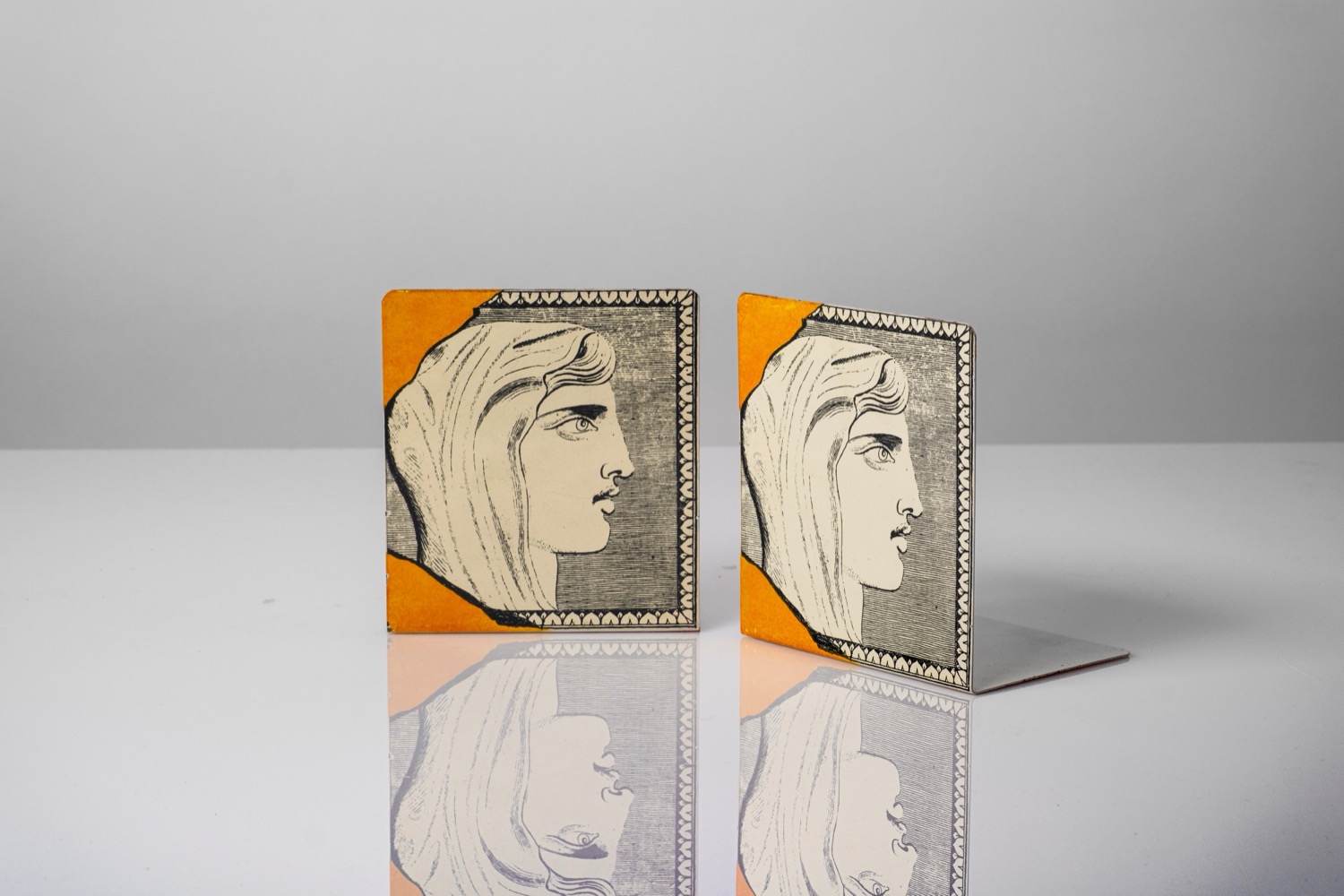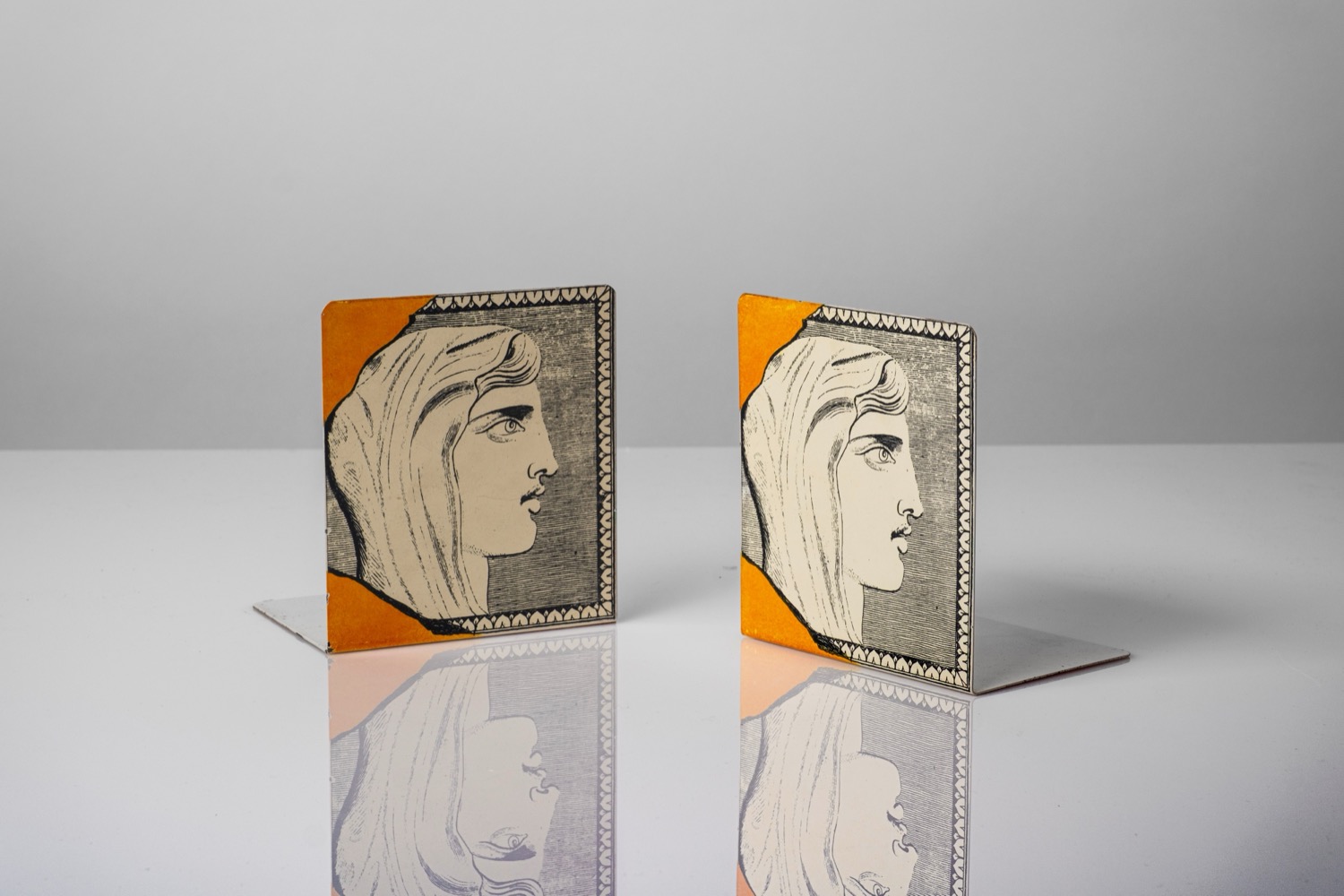 Piero Fornasetti (Milano 10/11/1913 - Milano 09/10/1988) - Coppia di fermalibri, decoro Frammenti antichi, 1950 circa