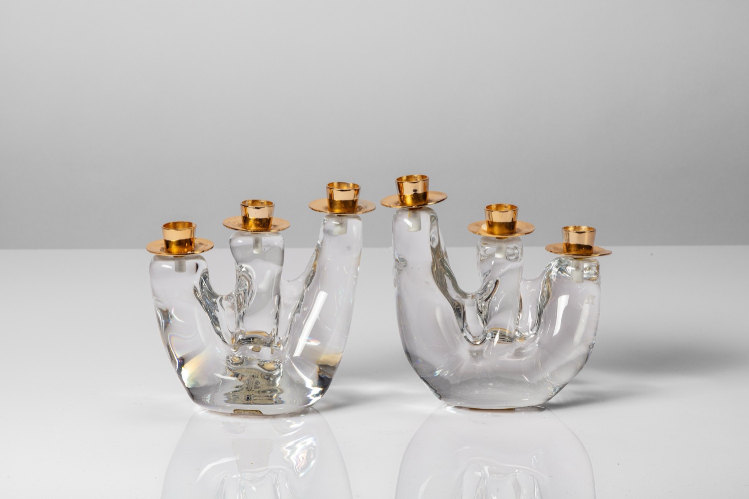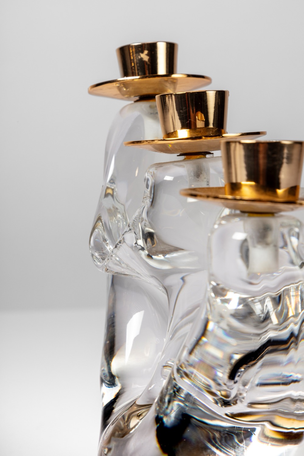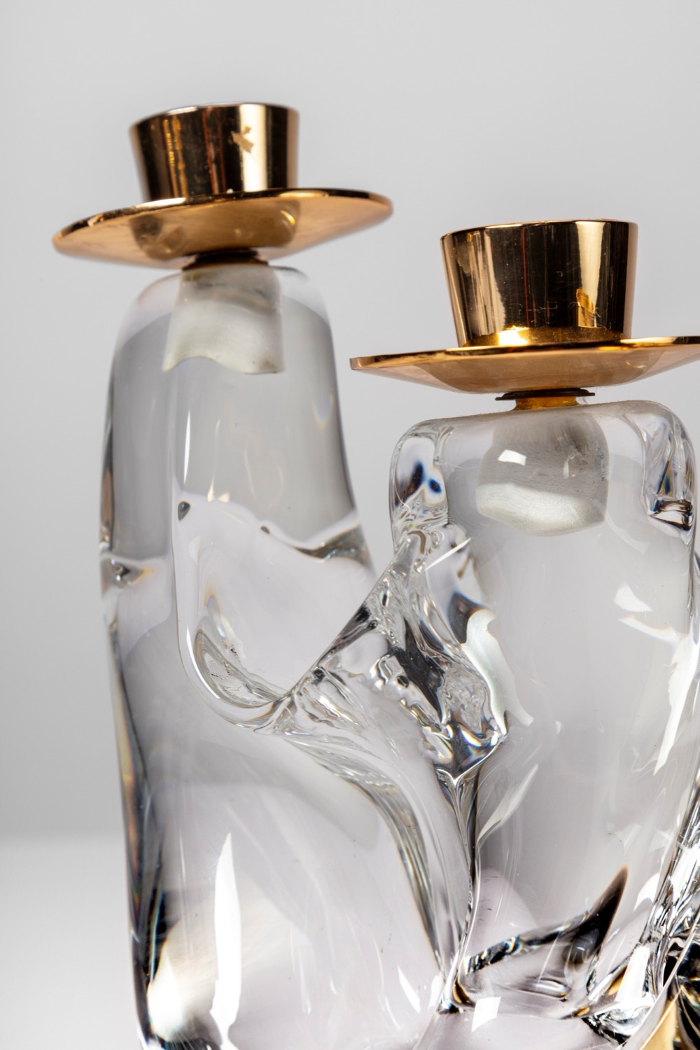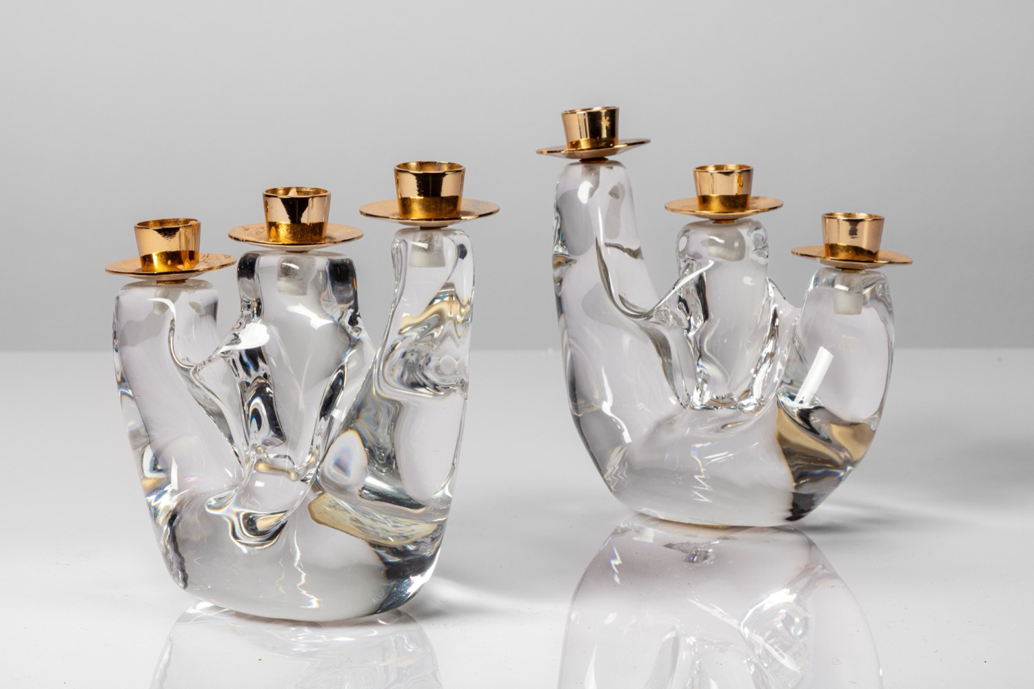 Coppia di candelieri scultorei in cristallo con portacandele in ottone