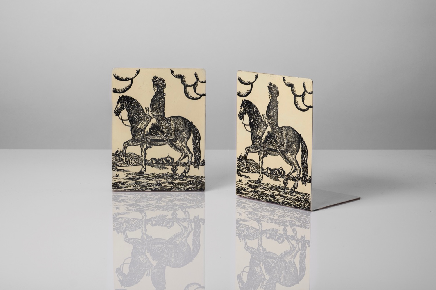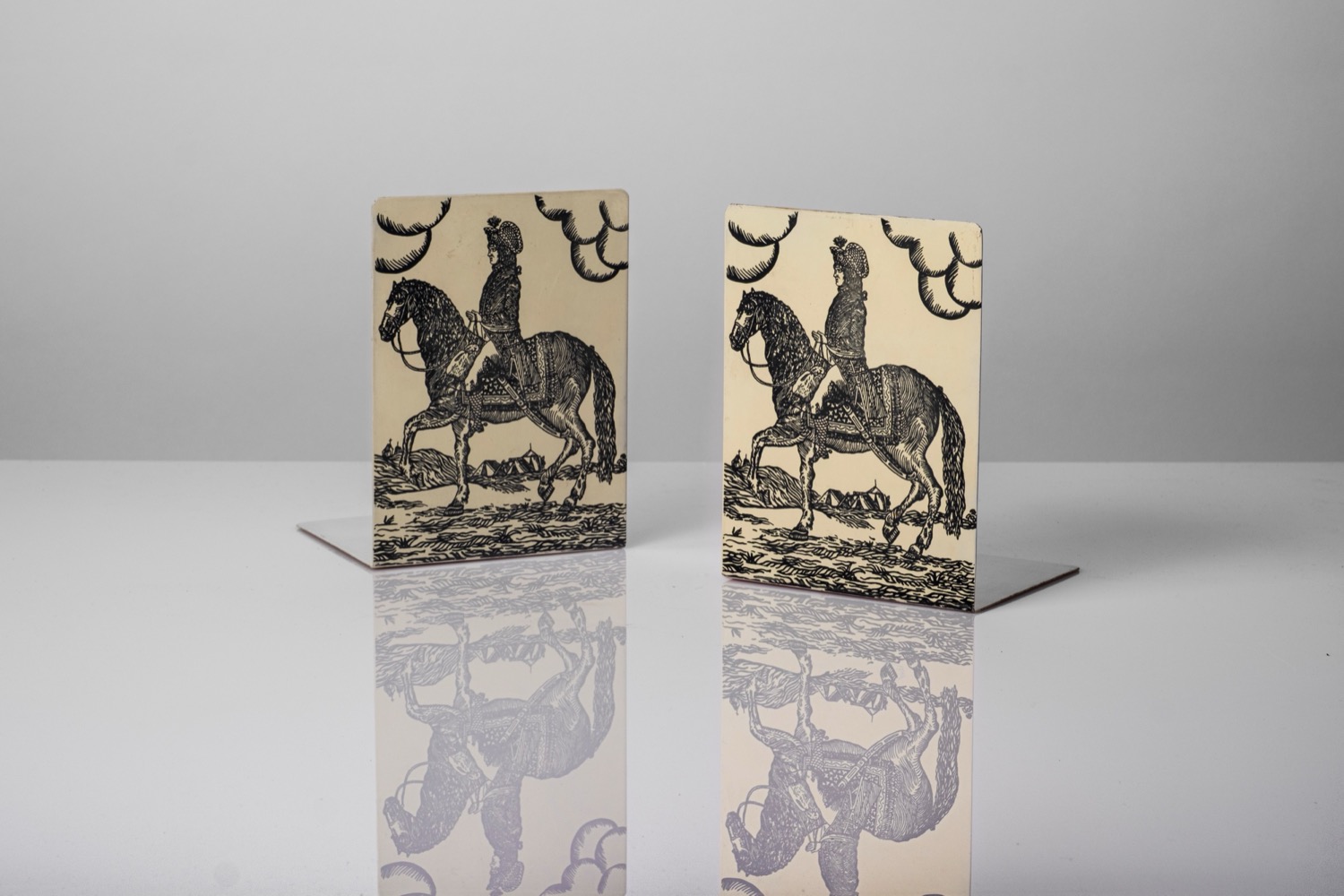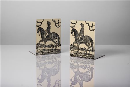 Piero Fornasetti (Milano 10/11/1913 - Milano 09/10/1988) - Coppia di fermalibri, decoro Cavaliere, 1960 circa