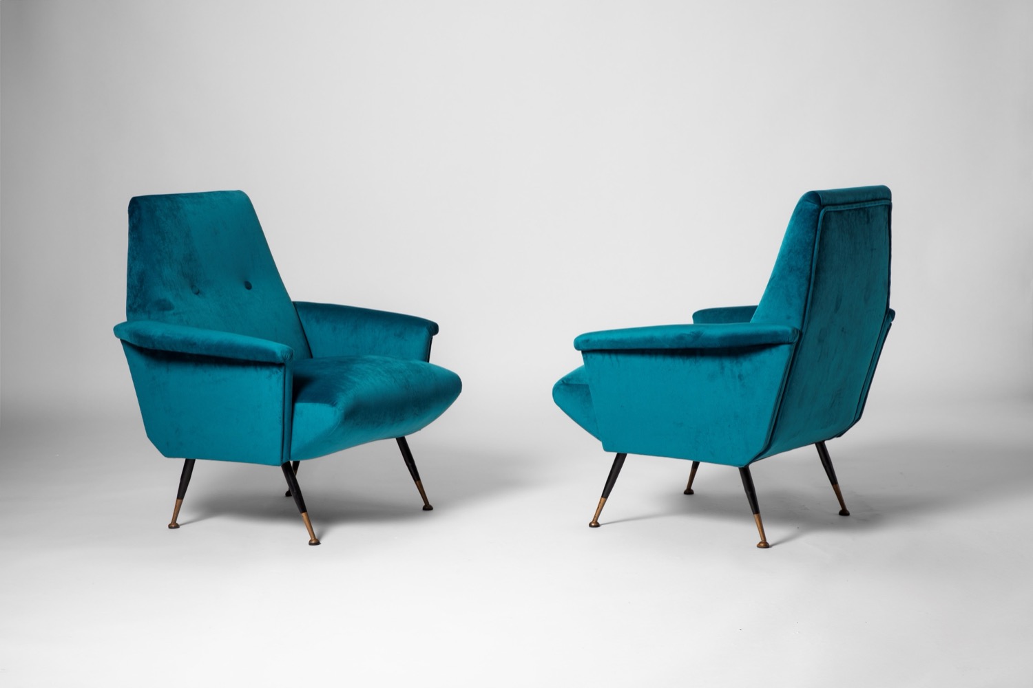 Coppia di poltrone con struttura in metallo verniciato, puntali in ottone e rivestimento in velluto