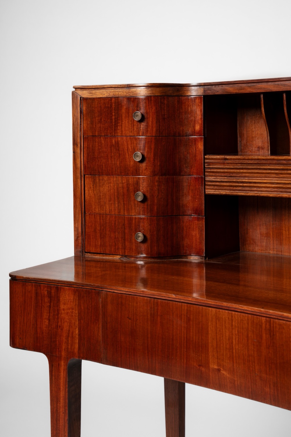 Elegante secrétaire da centro in legno impiallaciato con cassetti laterali sagomati, cassetto centrale grissinato e dettagli in ottone
