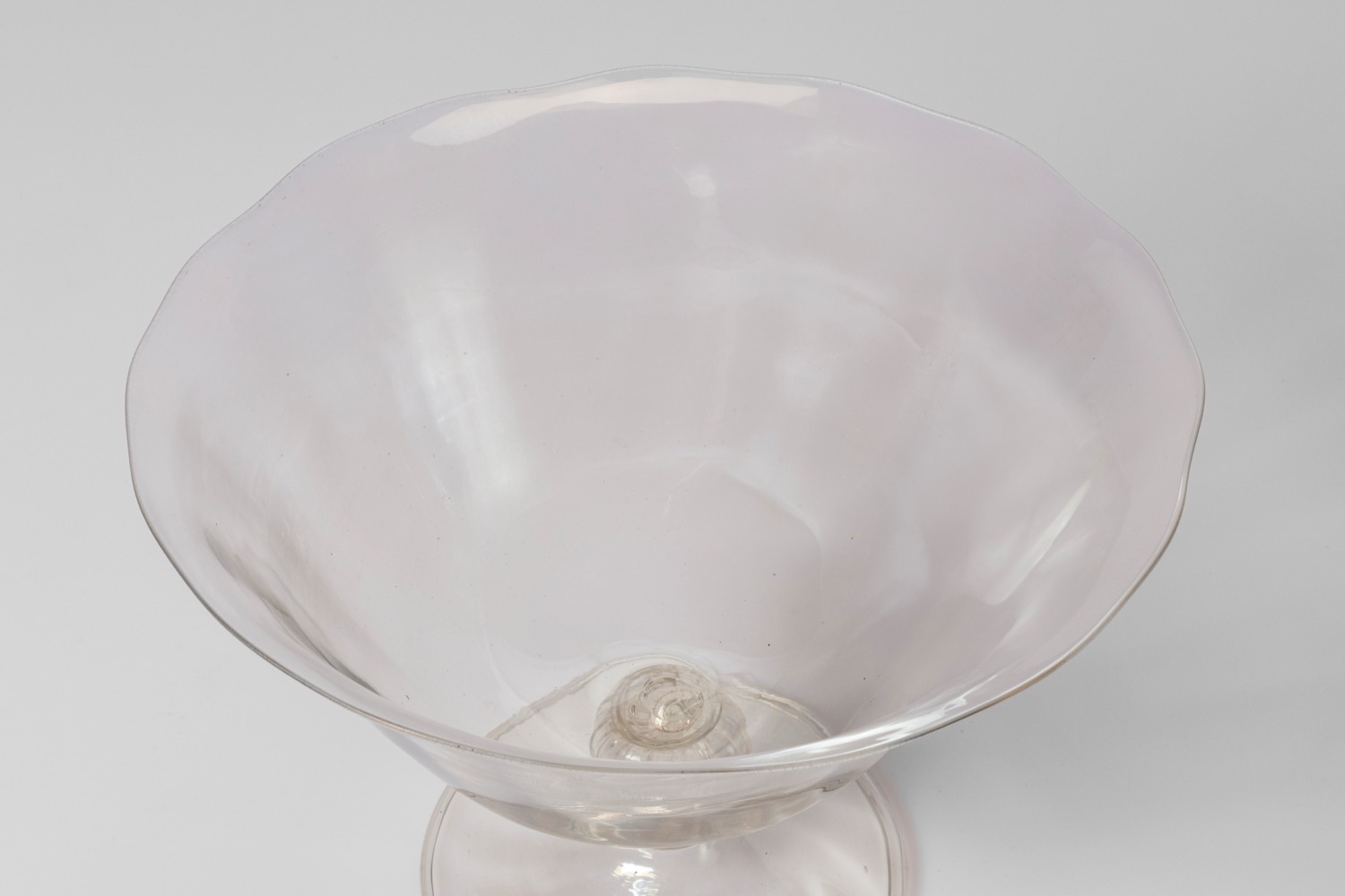 Coppa in vetro iridescente con bordo ondulato e piede applicato
