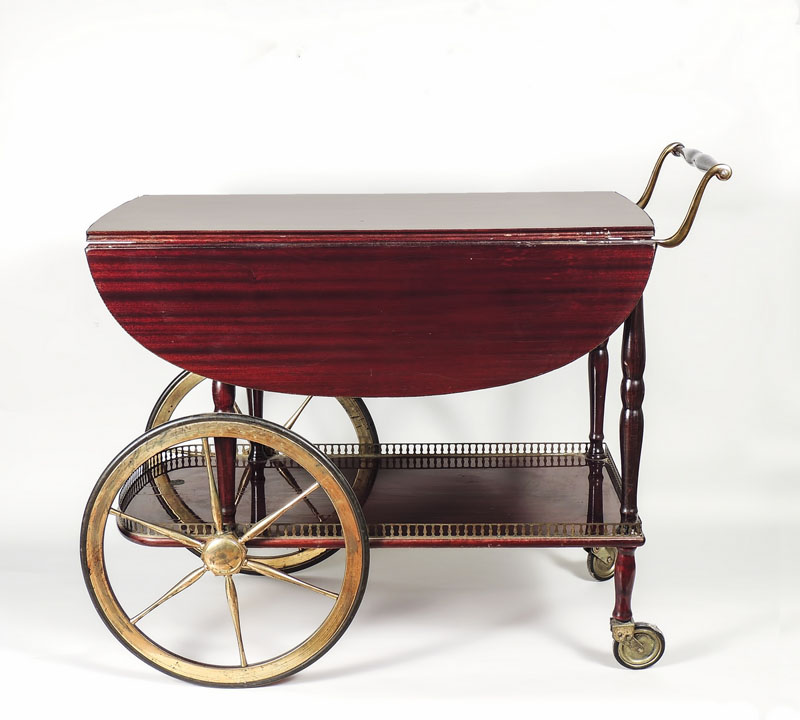 CARRELLO PORTAVIVANDE A BANDELLE IN SATINWOOD due ripiani, quello inferiore con bordo a ringhiera in metallo, quattro sostegni torniti, due poggianti su rotelle e due su grandi ruote a raggi h cm 75x95x45 SATINWOOD DROP-LEAF TROLLEY