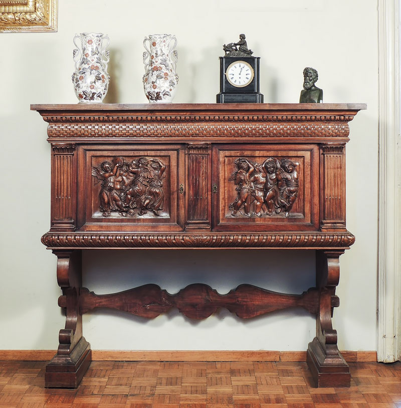 STIPO IN NOCE fine del XIX/inizio del XX secolo di gusto neorinascimentale, fronte a due sportelli scolpiti con gruppi di puttini musicanti e danzanti, lesene a colonna scanalata, sostegni a mensola riuniti da traversa sagomata h cm 133x149x49 A NEO RENAISSANCE WALNUT CABINET