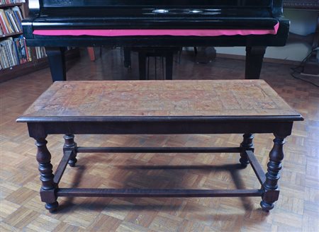 TAVOLINO BASSO IMPIALLACCIATO IN NOCE XIX secolo intarsiato con filettature e medaglione centrale a volute, sostegni torniti riuniti da traverse, difetti h cm 46x105,5x47,5 WALNUT VENEERED TABLE