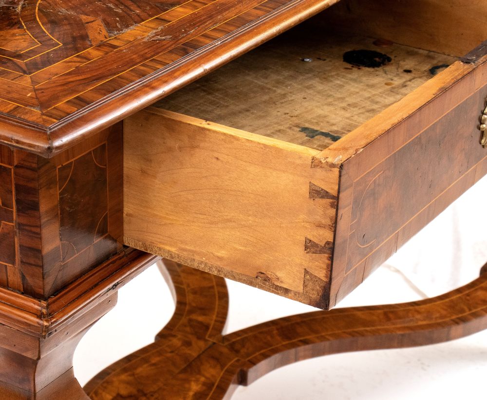 in noce e radica di noce, intarsiato in legni di frutto a motivi geometrici. Due cassetti frontali e alzata a otto cassetti.