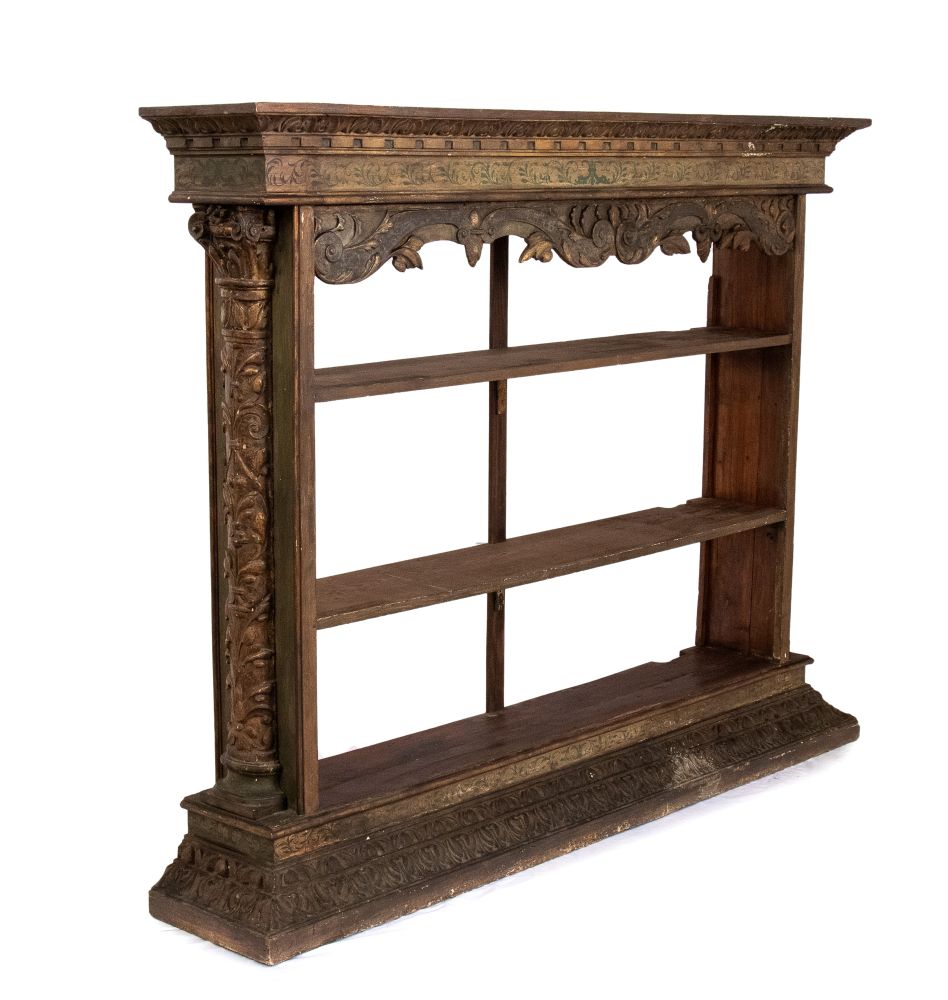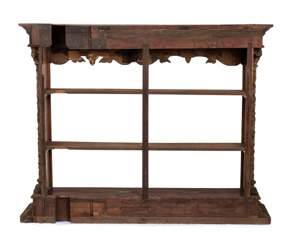 con colonne intagliate a motivi floreali doriche, dipinta a motivi floreali e con mantovana intagliata sul cappello.