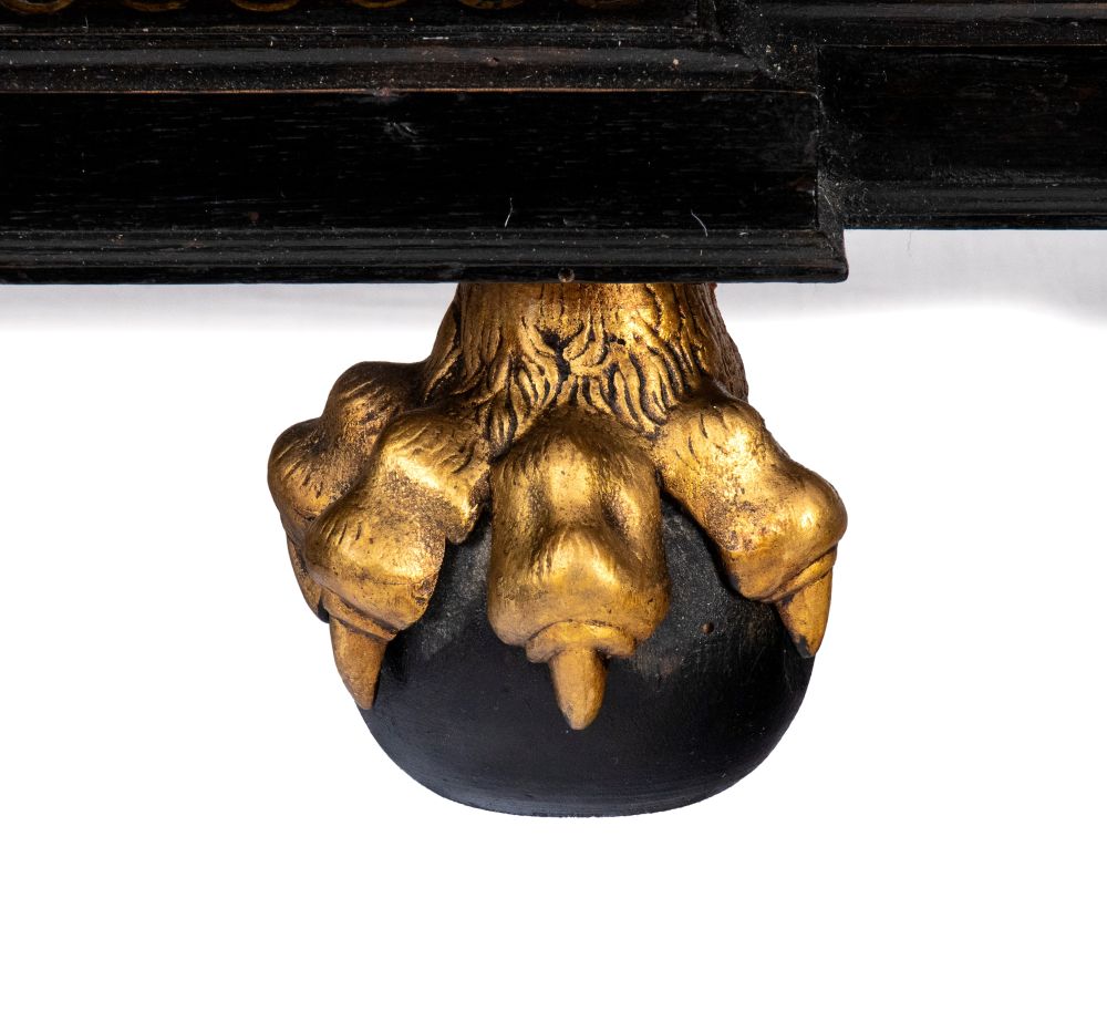 in legno ebanizzato con struttura in rovere, intarsiato in tartaruga (hawksbill sea turtle, Eretmochelys imbricata, Cheloniidae) e poggiante su pedi a sfera e artiglio.
