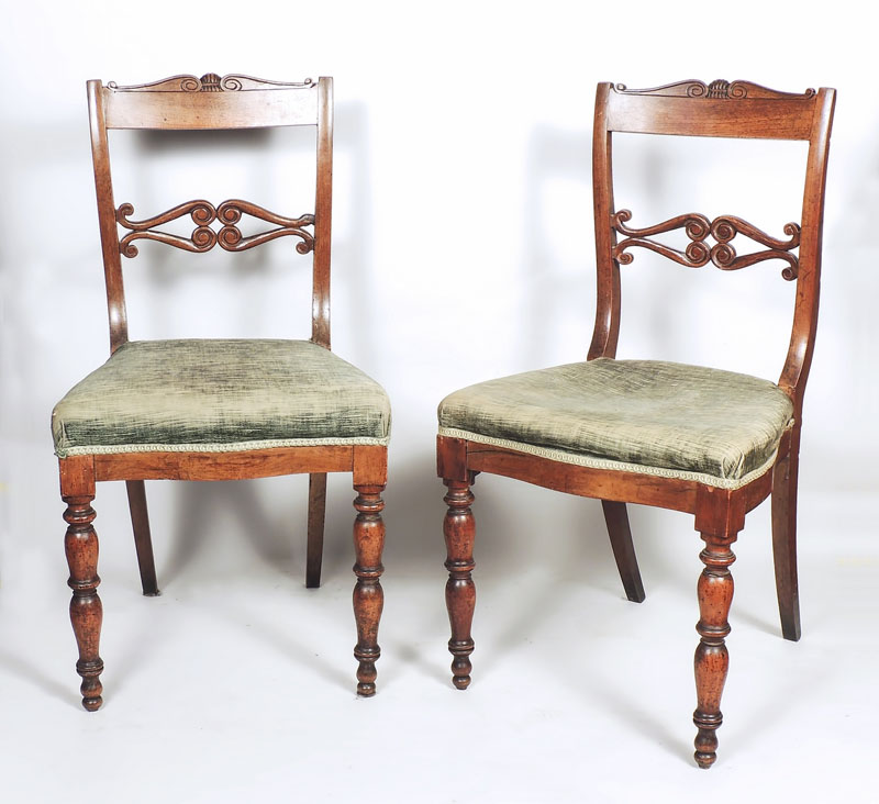 COPPIA DI SEDIE IN NOCE metà del XIX secolo schienale con cimasa intagliata e cartella traforata a volute contrapposte, gambe anteriori tornite, le posteriori a sciabola, seduta sagomata, imbottita e rivestita in tessuto verde, difetti PAIR OF WALNUT CHAIRS, MID 19TH CENTURY