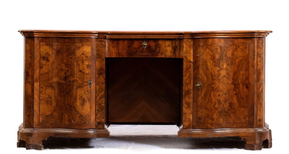 di linea mossa interamente lastronata in radica di noce, piano in pelle con tiretto estraibile centrale.