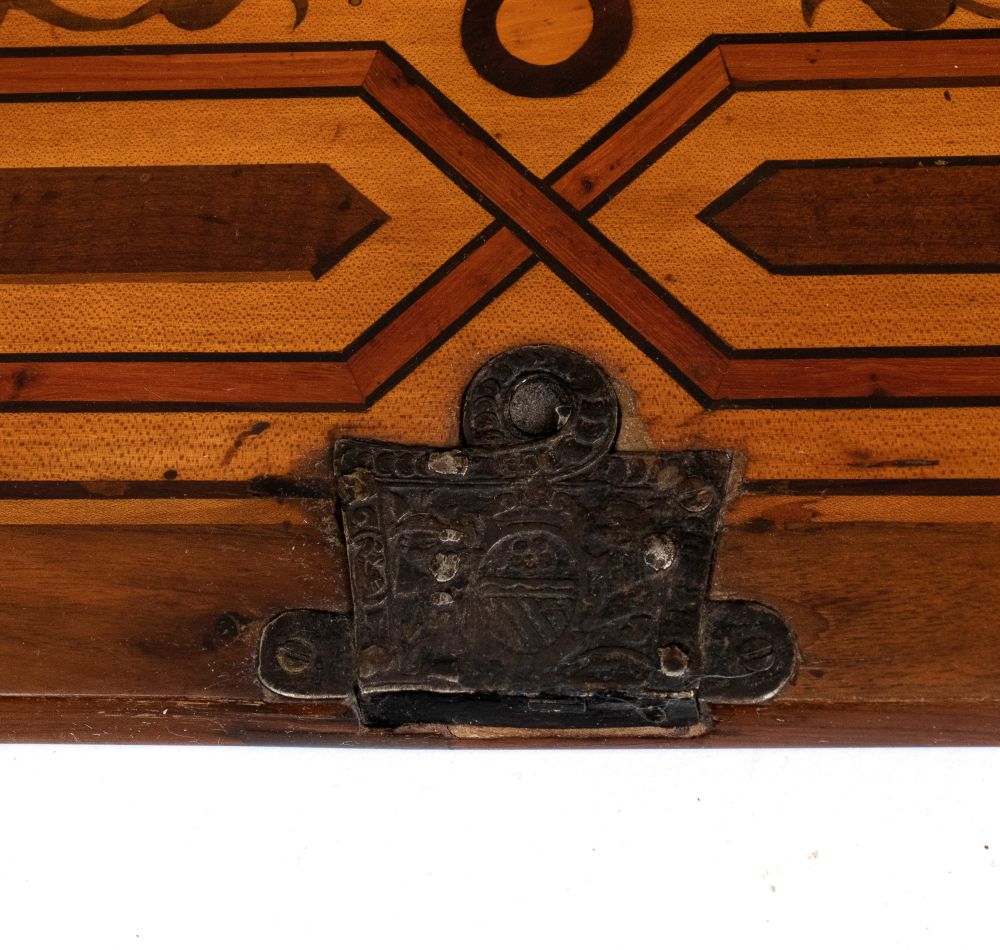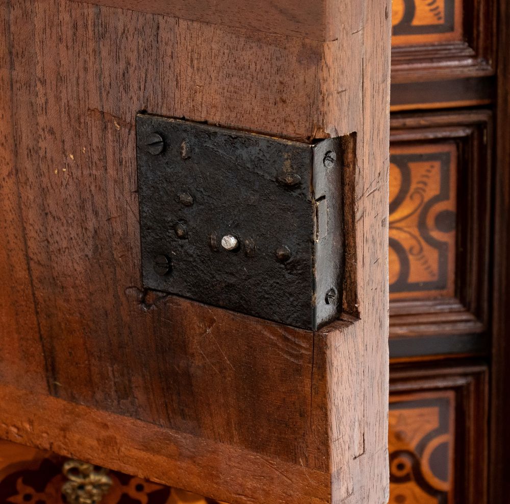 elegante monetiere da appoggio di manifattura tedesca, risalente XVIII secolo, realizzato in legni pregiati, noce, palissandro e finemente intarsiato.La struttura è rettangolare con base a zoccolo modanato. Il fronte è arricchito da intarsi geometrici e floreali in bois de rose, acero e radica.