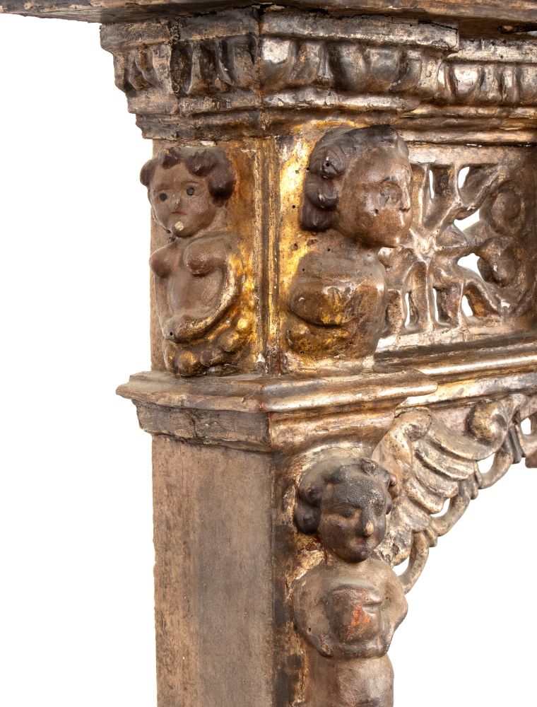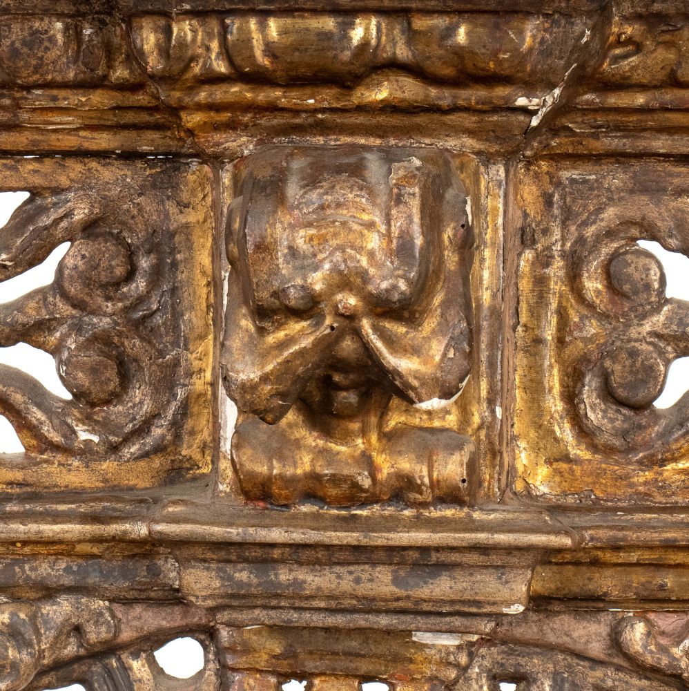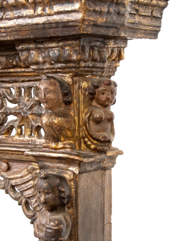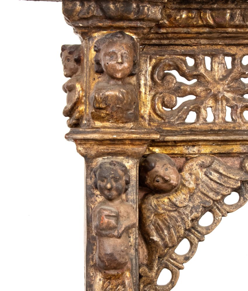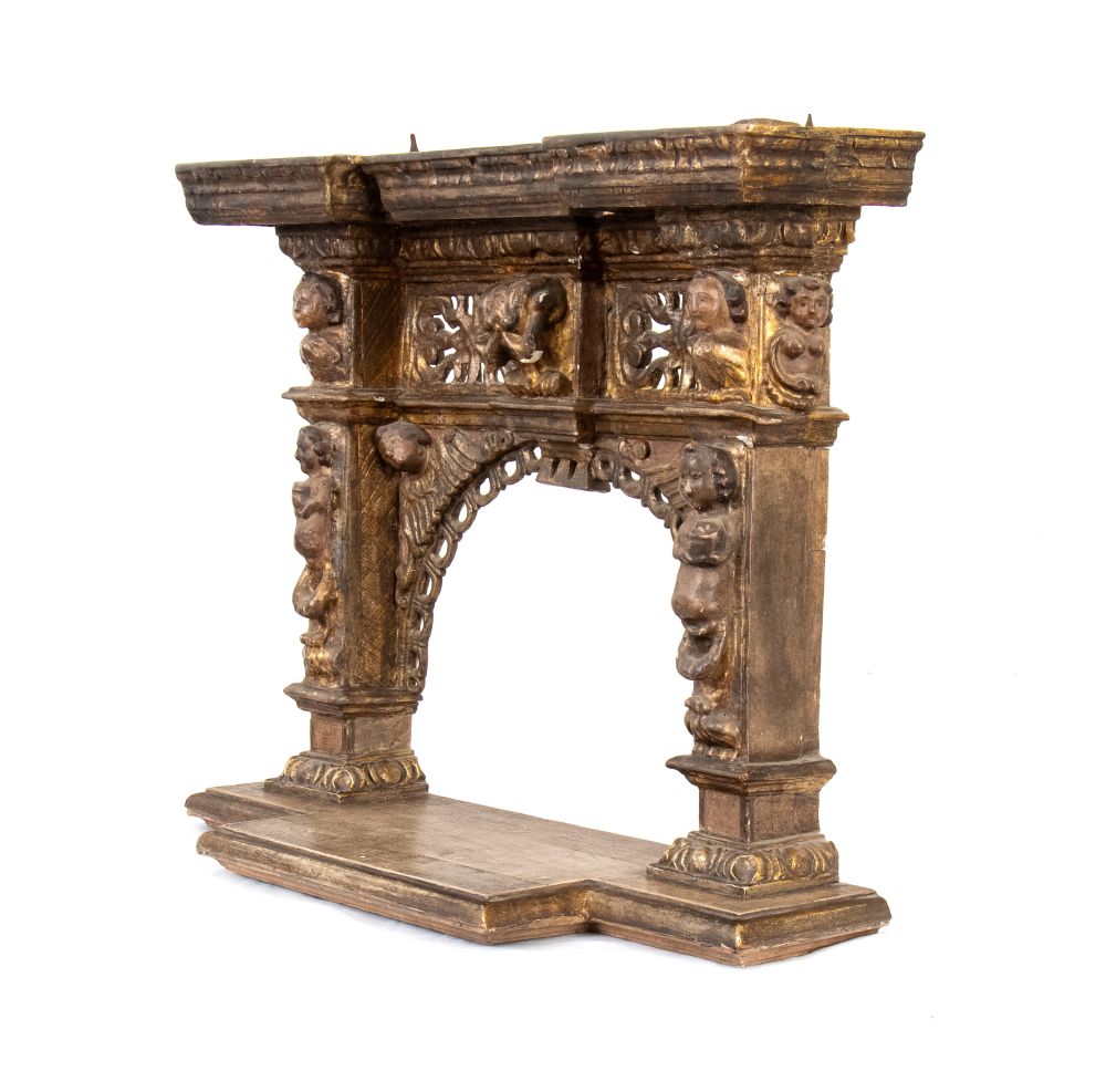 in legno intagliato, laccato e dorato, fine cinquecento primi seicento, figure di putti e serafini sulle colonne sulla parte ad arco e i lati. In parte traforato a motivi geometrici con basamento rettangolare sagomato.