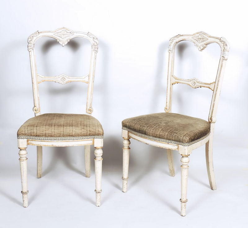 SERIE DI QUATTRO SEDIE BASSE LACCATE BIANCHE schienale sagomato intagliato con rosone e foglie d'acanto, cartella a stecca, gambe anteriori a cono, le posteriori a sciabola, profili dorati, seduta imbottita e rivestita in velluto verde, difetti A SET OF FOUR LACQUERED CHAIRS