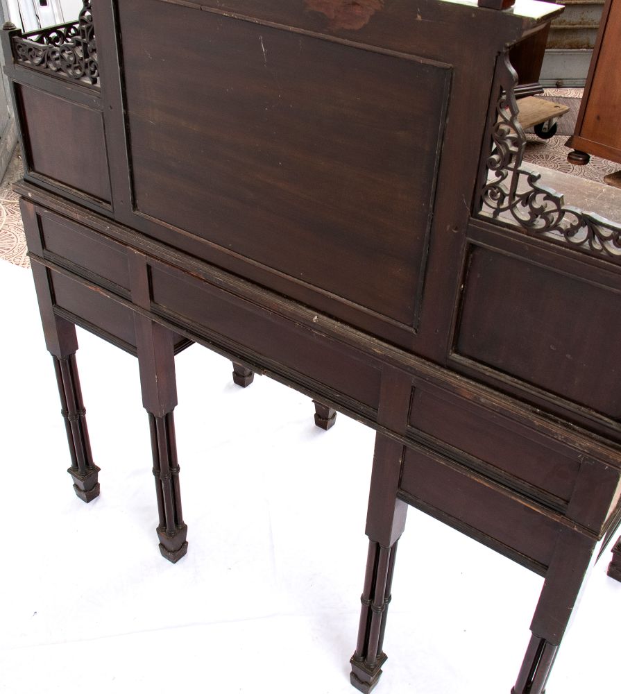 in legno di mogano finemente intagliata a motivi orientali, fronti dei cassetti inferiori e superiori a traforo cieco. Gambe "cluster column".