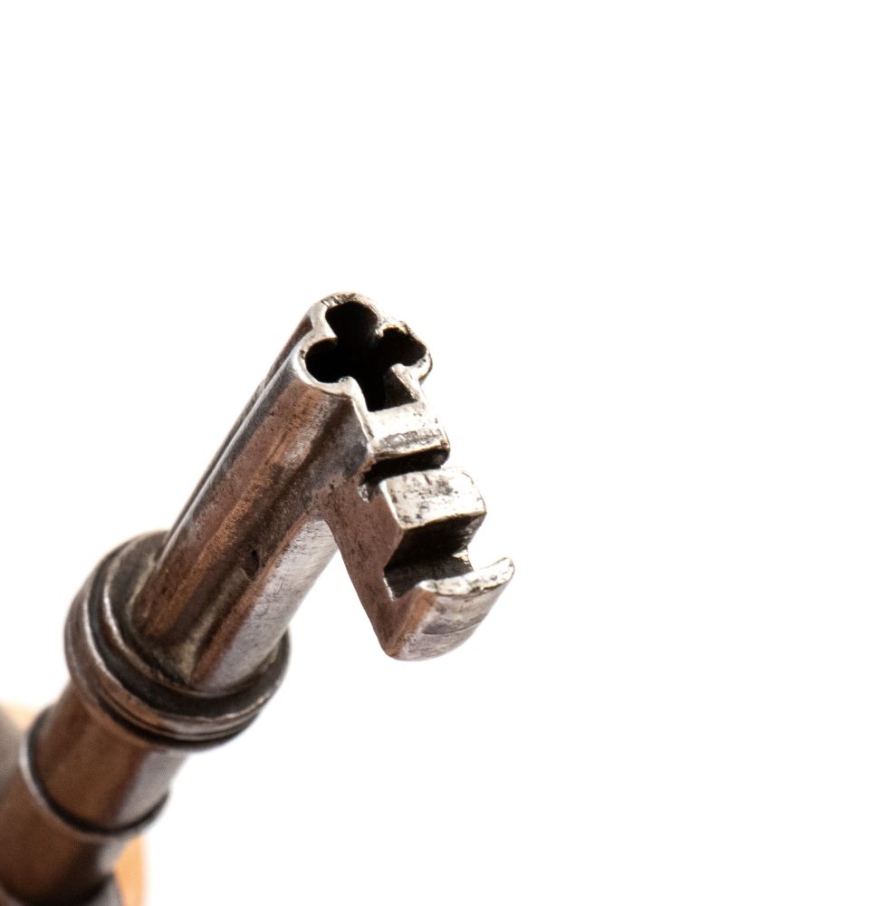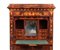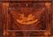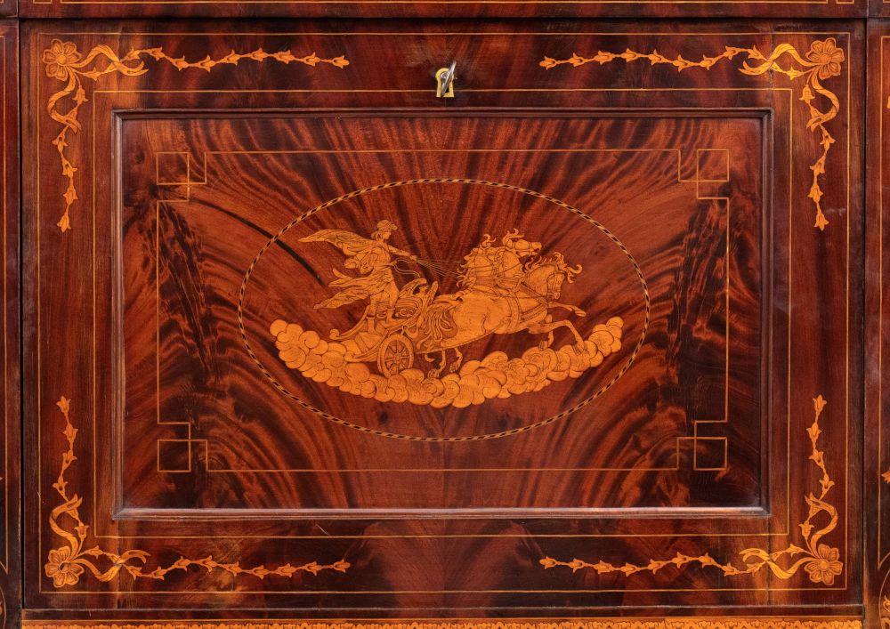 magnifico esempio di ebanisteria fiamminga, in piuma di mogano e mogano, finemente intarsiato in legni di frutto a motivi floreali e nella parte centrale della calatoia c'è raffigurato il Dio Apollo sul carro. Lo scarabattolo è costituito da una serie di cassetti e da un portico con colonne con in fondo specchio. Cassetto sulla parte superiore, due sportelli con all interno un ripiano nella parte inferiore che cela anche un cassetto segreto.