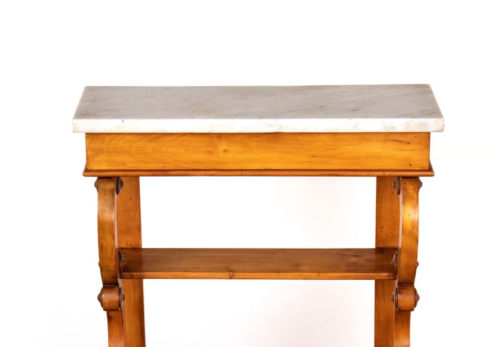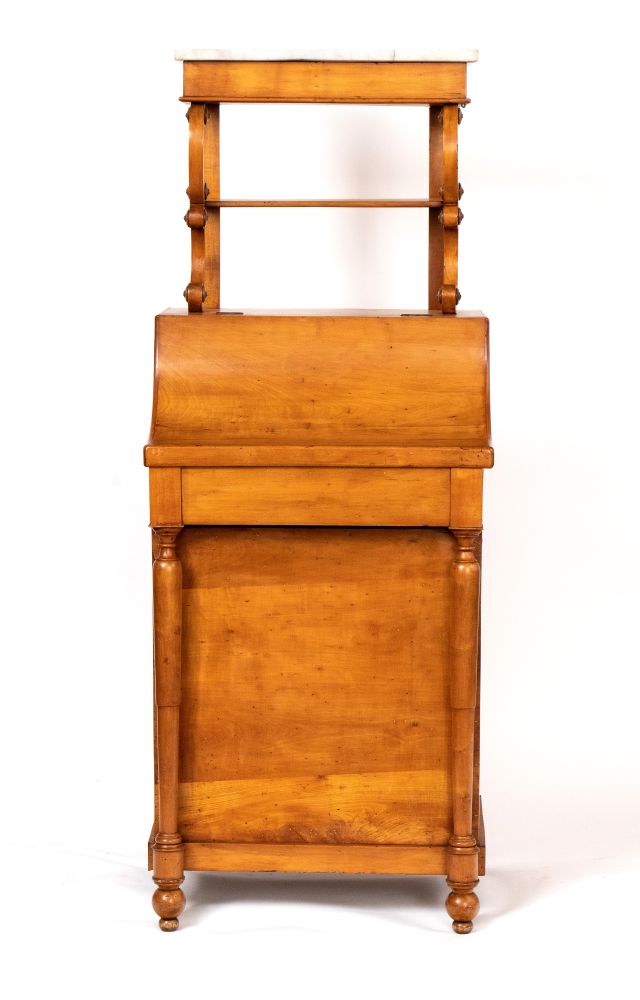 in legno di ciliegio, con alzata a due piani e piano apribile con porta bottiglie e bicchieri. Sulla parte alta un piano in marmo bianco a celare un vano nascosto.