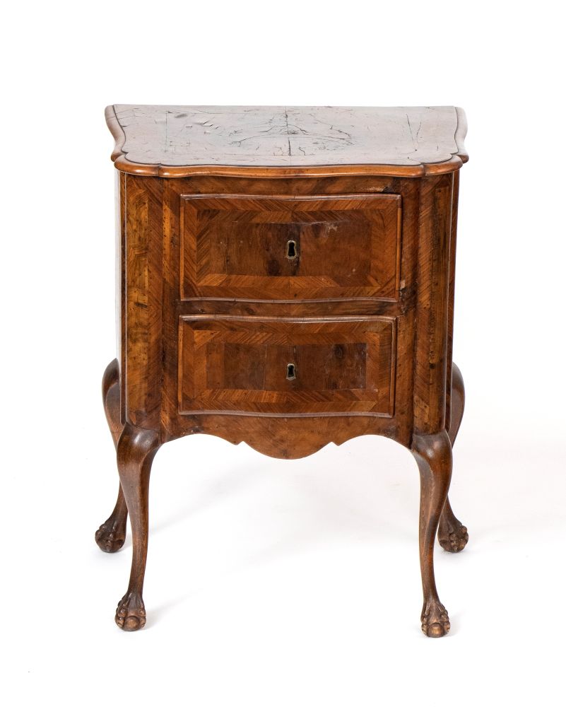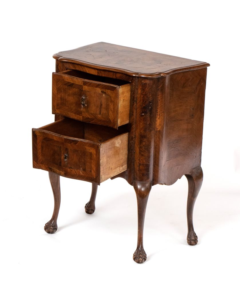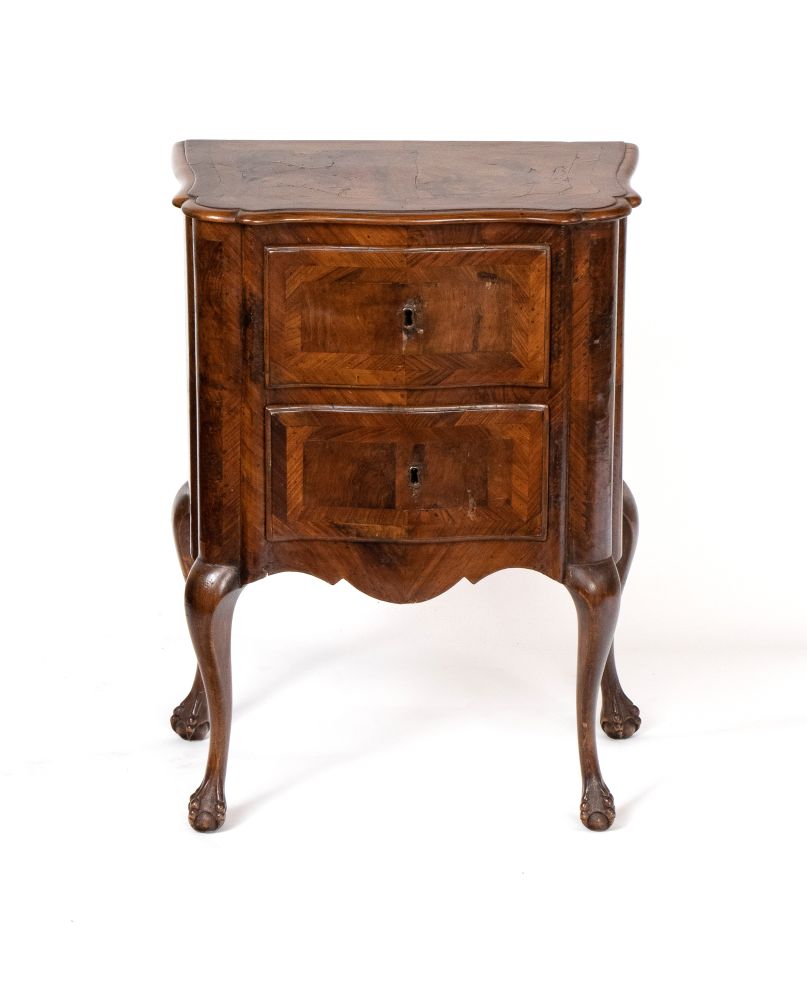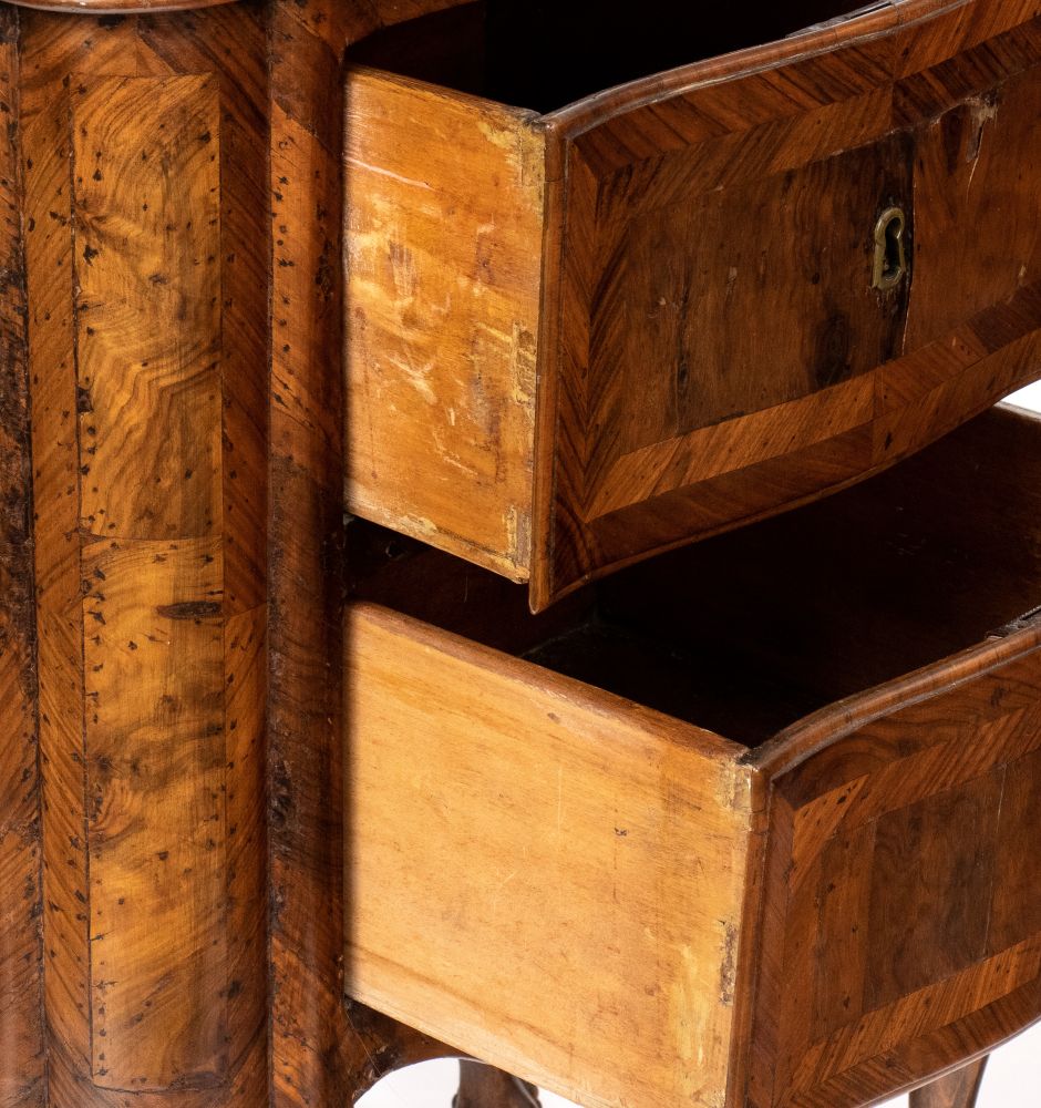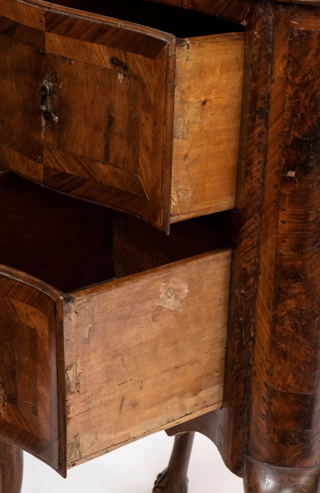 in legno di noce e radica di noce, fronte mosso a due cassetti, poggianti gambe cabriolet.