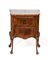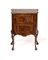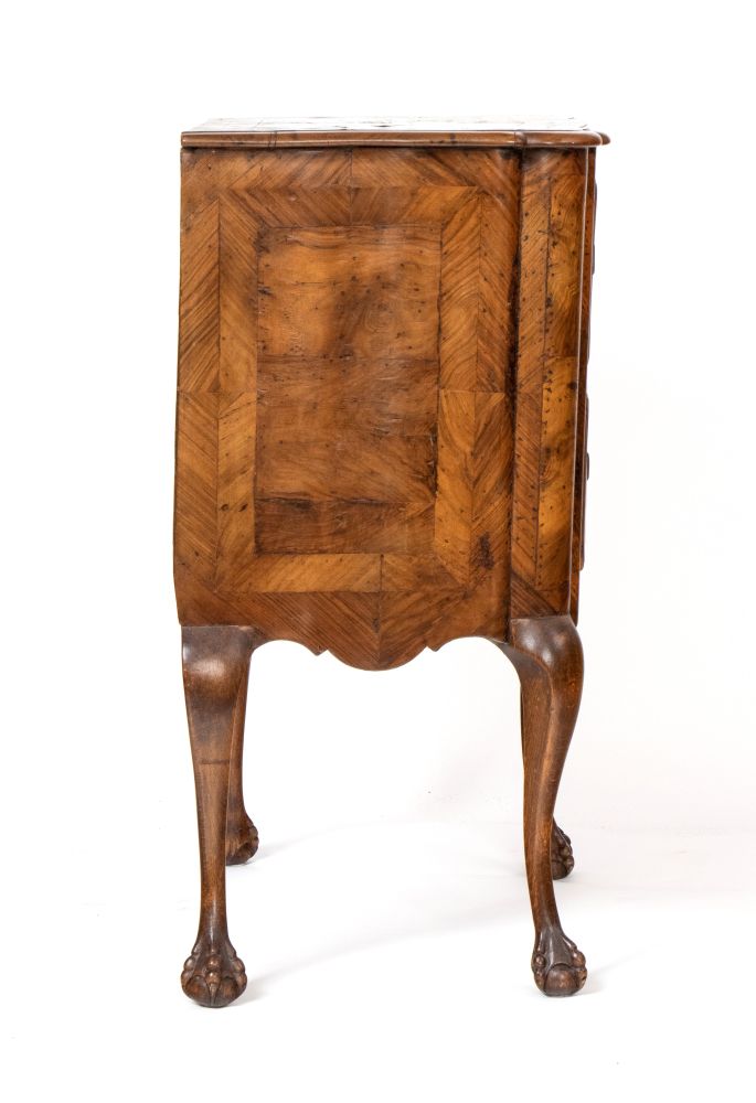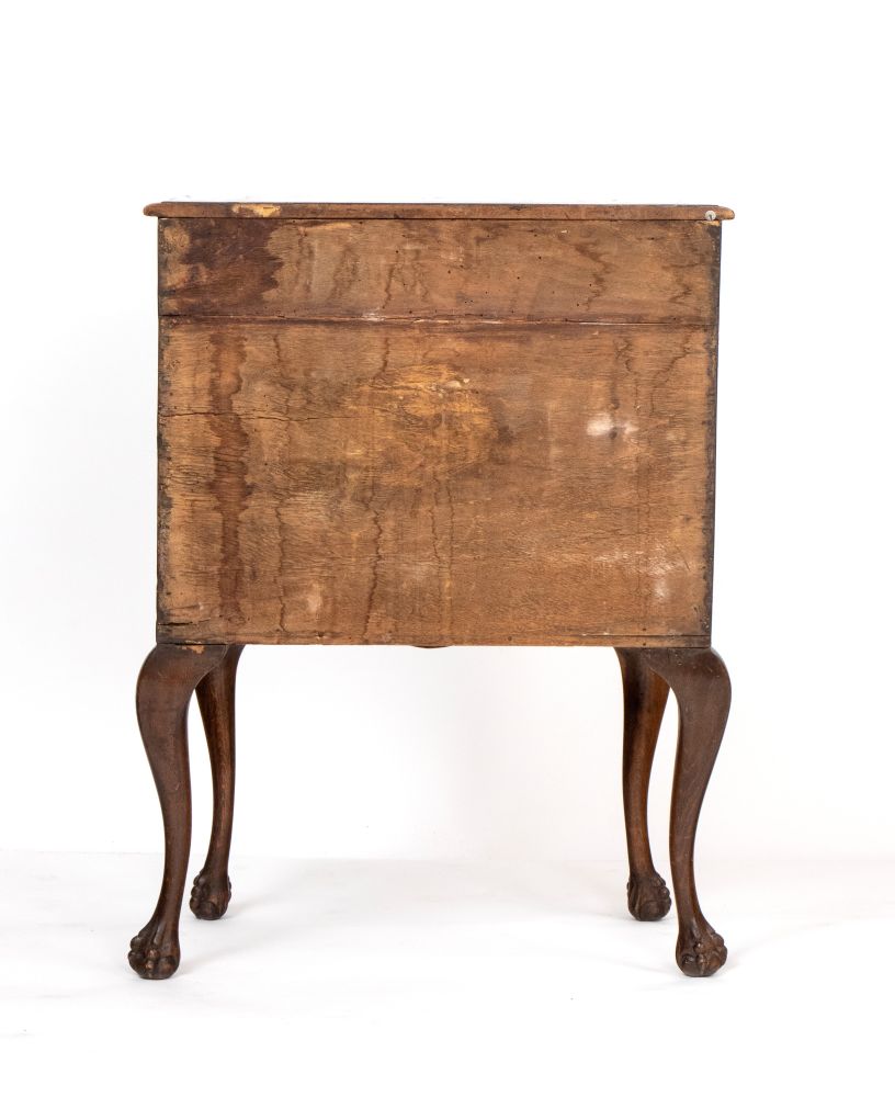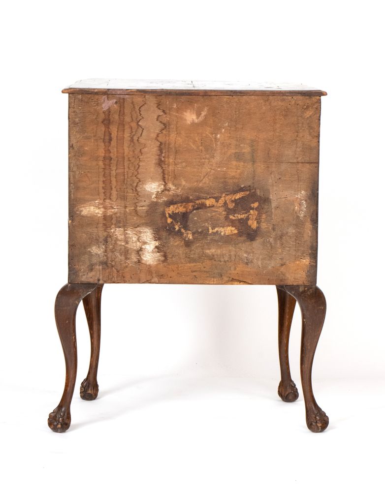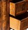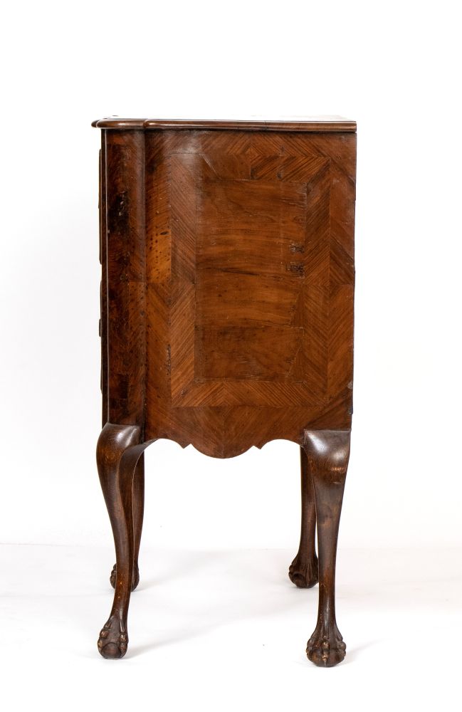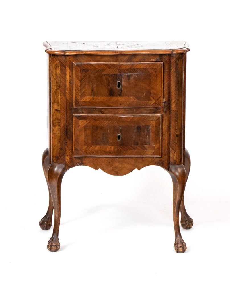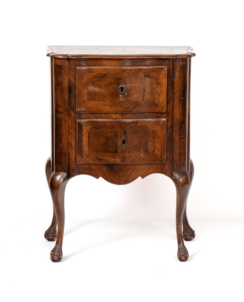 in legno di noce e radica di noce, fronte mosso a due cassetti, poggianti gambe cabriolet.