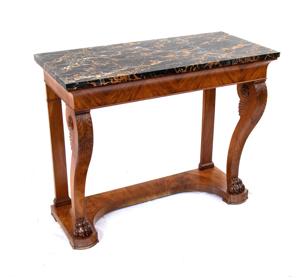 lastronata in noce, piano in marmo di forma rettangolare, fascia liscia, sostegni posteriori diritti e anteriori in foggia di grande voluta rivolta verso l’interno ornata nella parte superiore da foglie d'acanto nella parte frontale e rosoni laterali, piedi a zampa ferita, pedana sagomata.