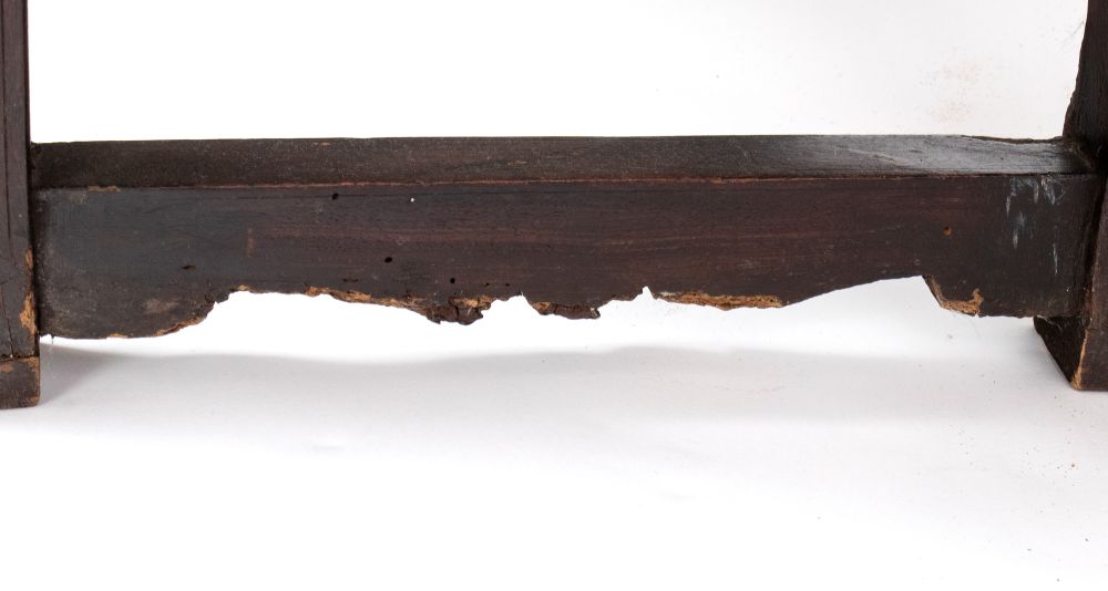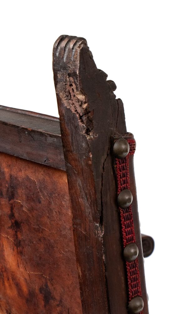 in legno di noce, intagliate sui montanti, sul frontale e sul retro della parte bassa della seduta.