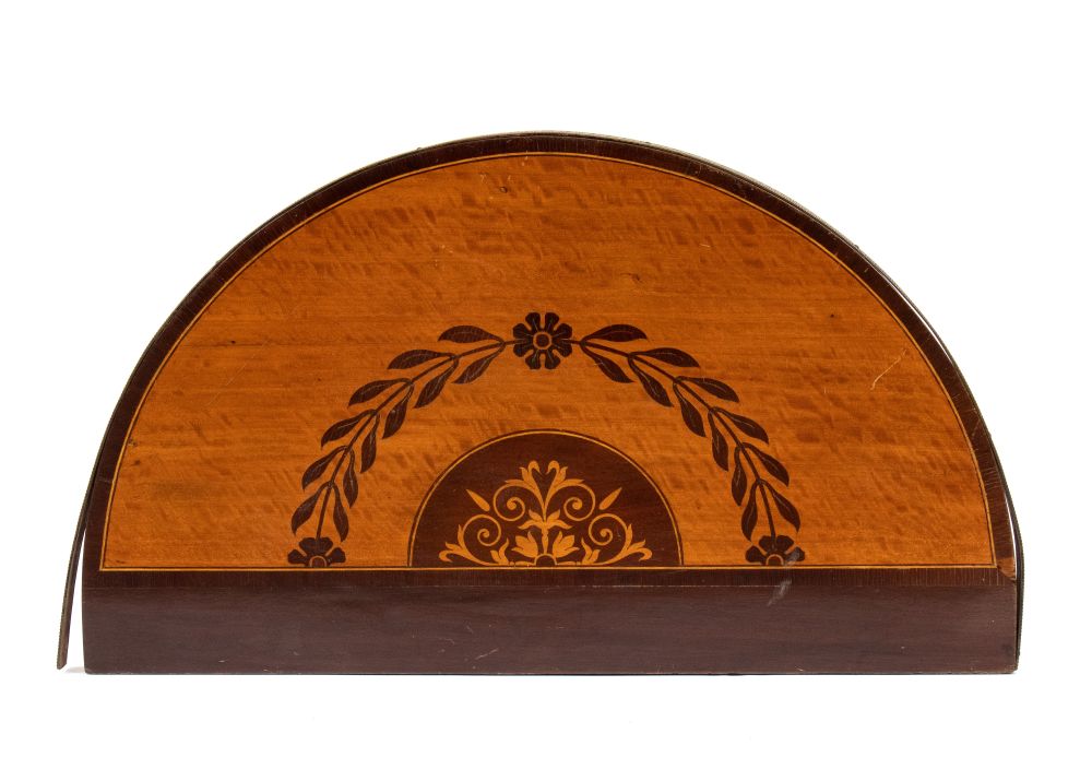 in legno di satinwood intarsiato in legni di frutto. Gamba centrale mossa con terminale in bronzo, il piano con decorazione perimetrale in bronzo dorato.