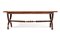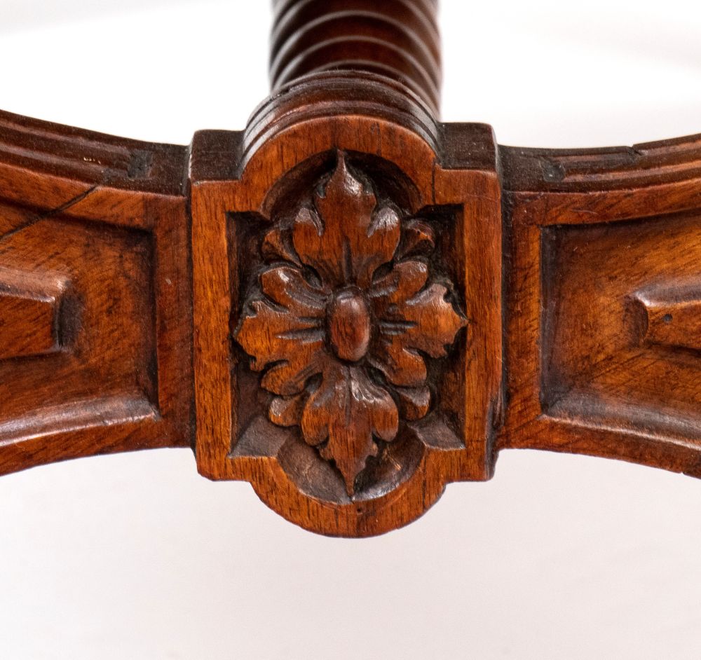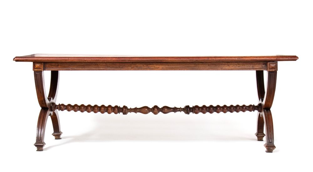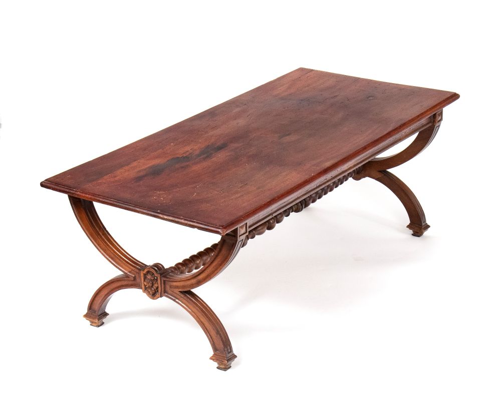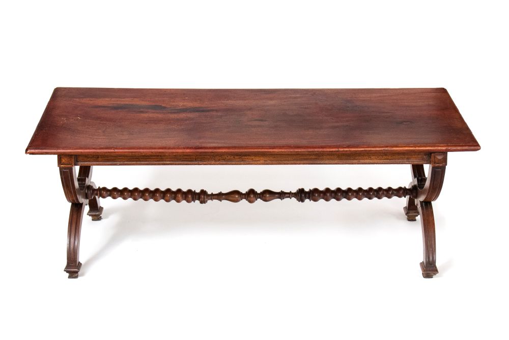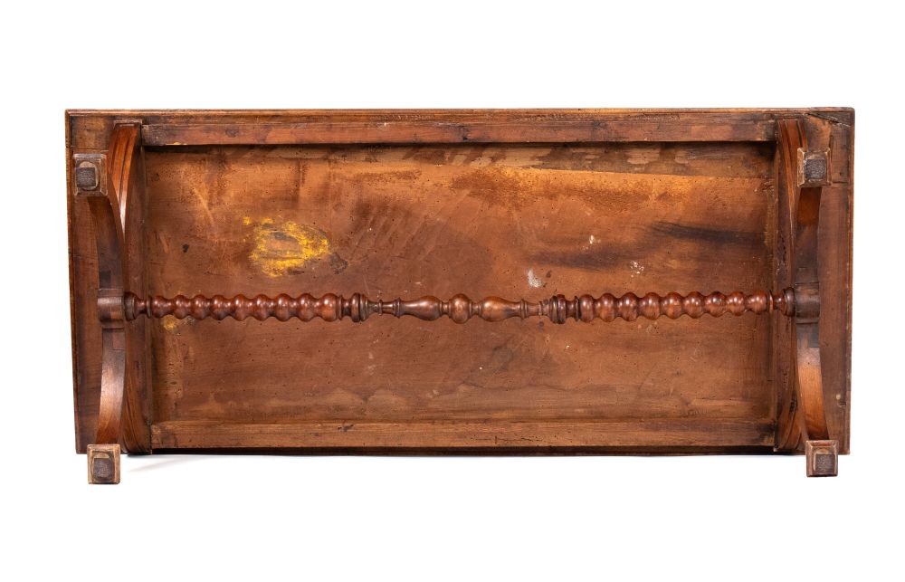 in legno di noce, piano unica tavola, gambe curve raccordate da traversa a torciglione.