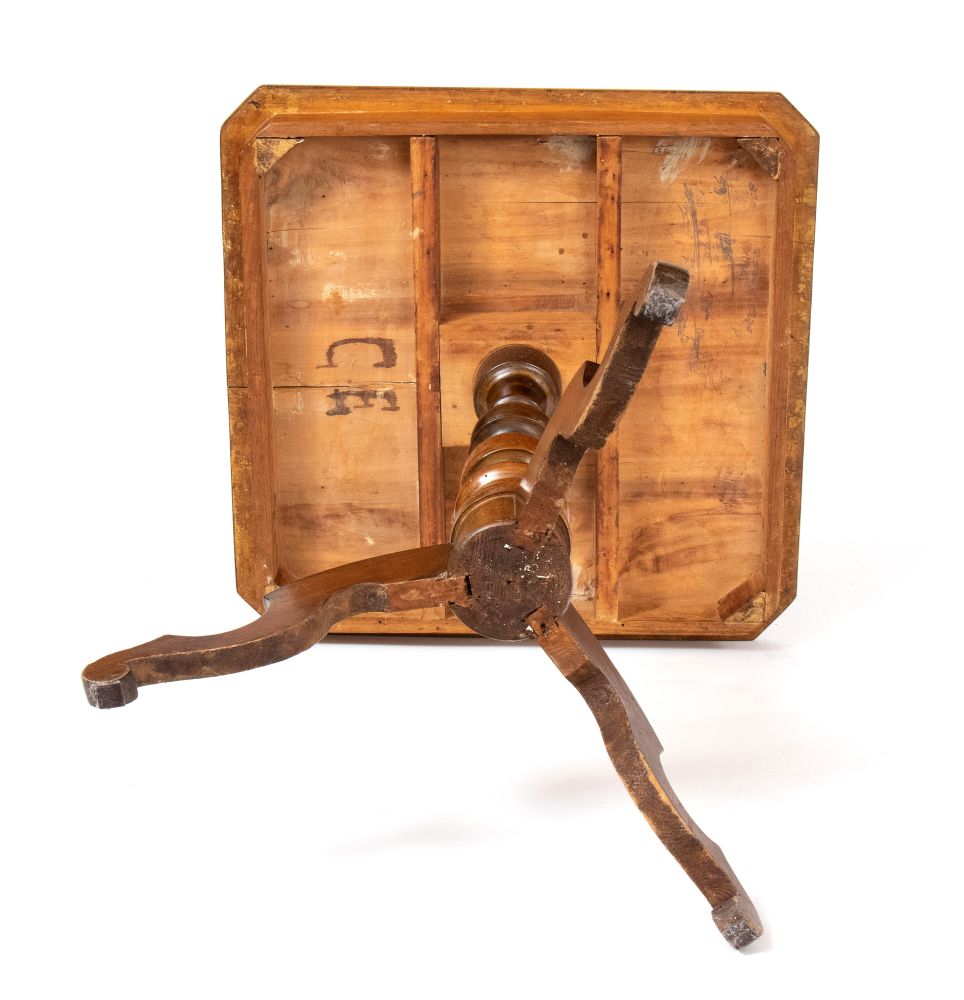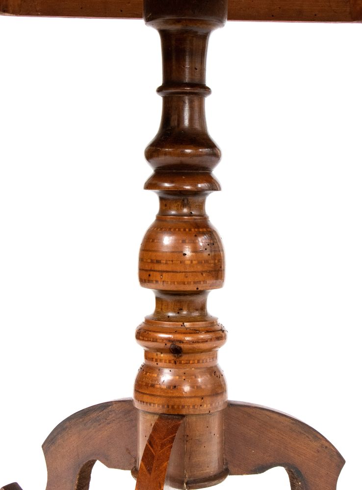 di forma quadrata in legno di noce intarsiato a motivi geometrici in legni di frutto. Piede a ceppo centrale lavorato e con parti ebanizzate.
